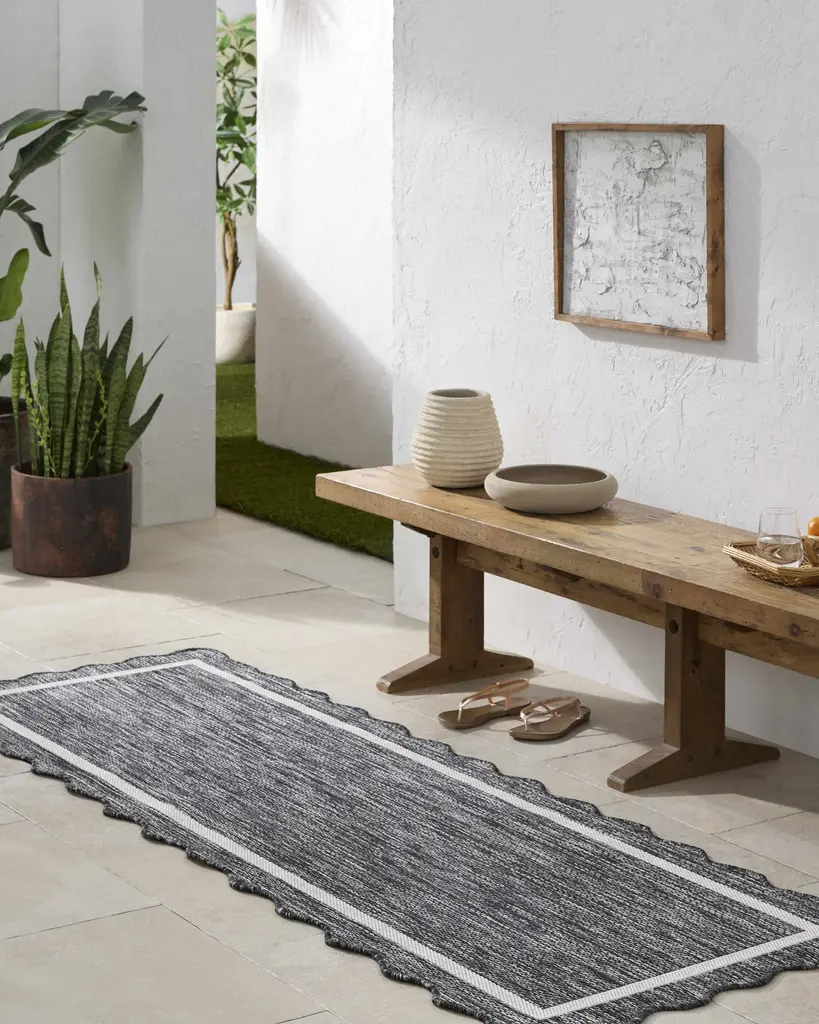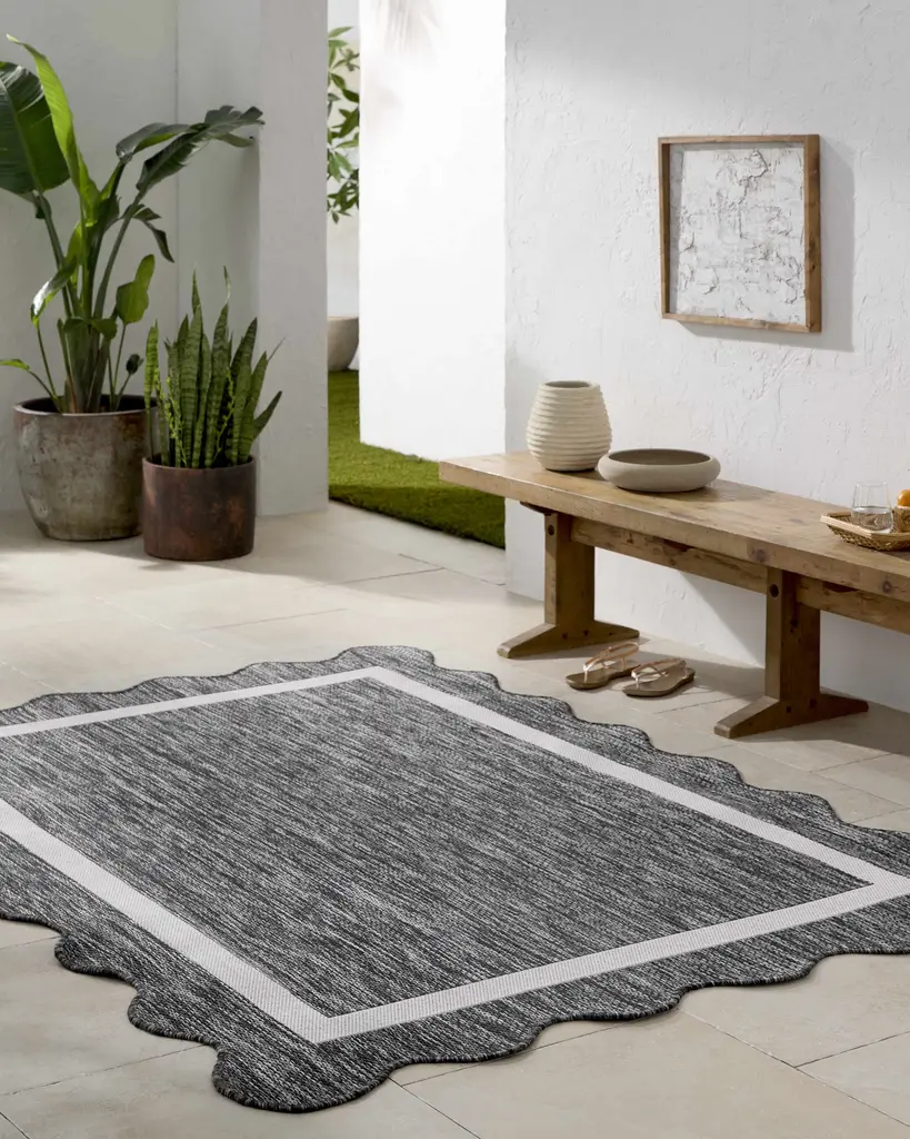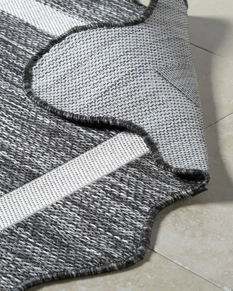 Collection: Varro Colors: Black, Cream Construction: Machine Woven Material: 100% Polypropylene Styles: Traditional Outdoor Safe: Yes Made In: Turkey Thickness: 0.08" Price Range: $$$$$ (Most Affordable)