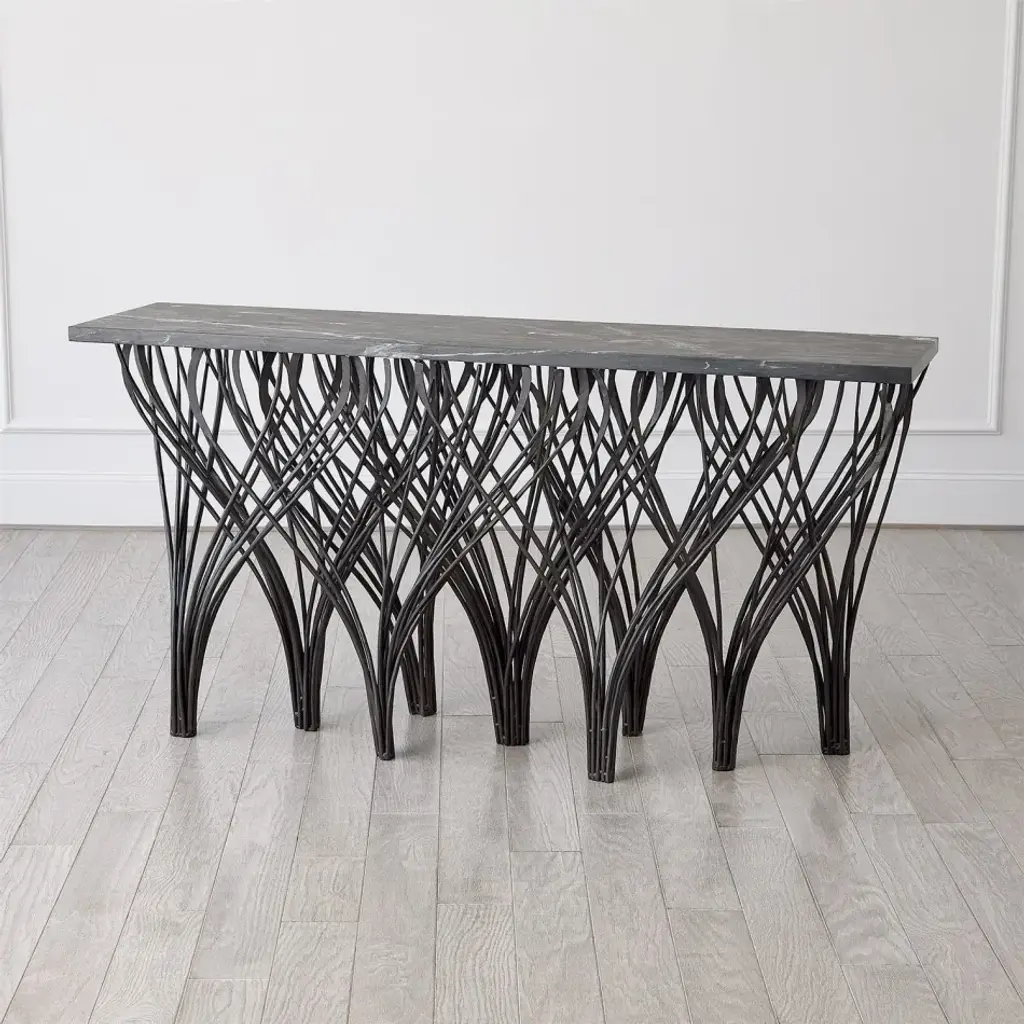 The Vector Console is the perfect blend of architectural design and artisanal craftsmanship. Handcrafted from iron, the console boasts a natural finish and features a luxurious black marine leather marble surface creating a true statement of style and elegance. As marble is a natural product, please be aware that there will always be variations in veining and color. This is to be expected and makes every marble product uniquely your own. From a fashion forward perspective, Global Views offers accessories, furniture, statement lighting, and an assortment of rugs and mirrors to add beauty and joy to your home.