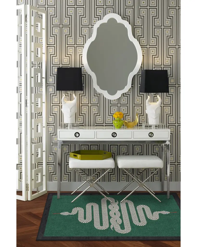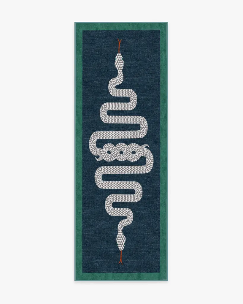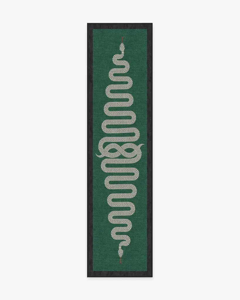 Sleek, sexy, and showstopping. This fierce rug features two black and white serpents sprawled on an emerald green background with a solid black border. Water-resistant, stain-resistant, and machine-washable.
