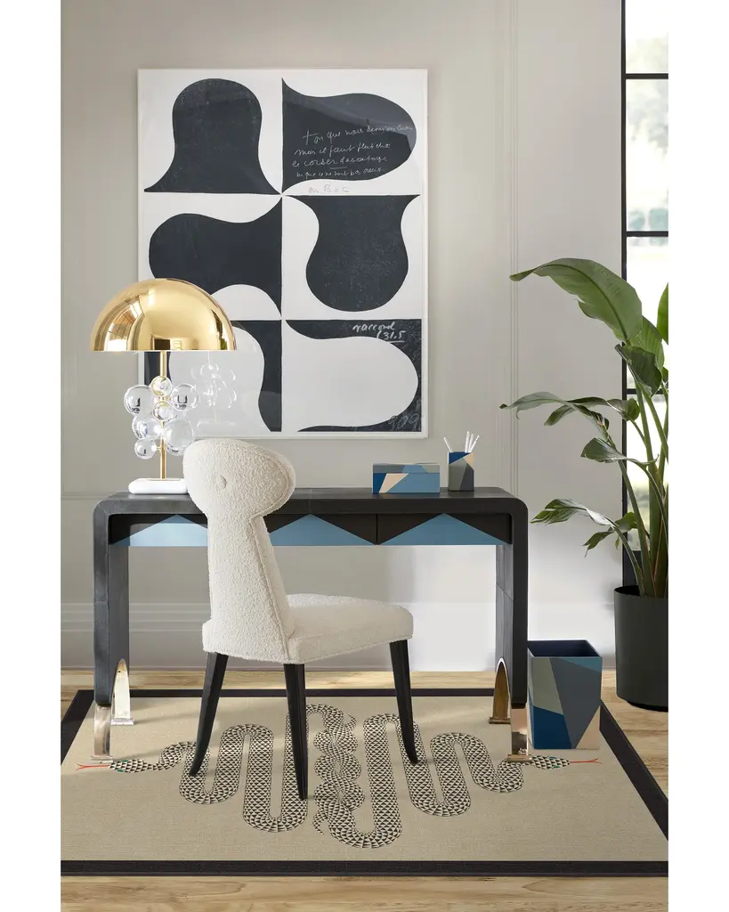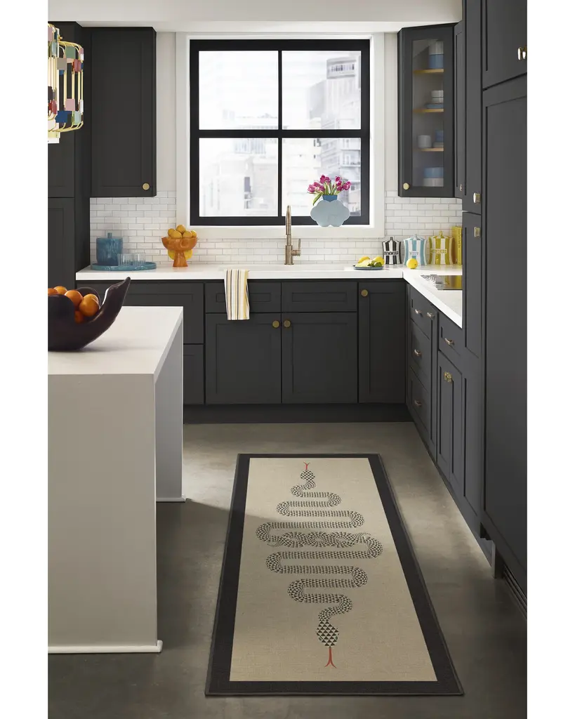 Sleek, sexy, and showstopping, our Jonathan Adler Venom Neutral Rug is the perfect way to make a statement. This fierce rug is sure to turn heads with two intertwining serpents sprawled on an ivory background with a bold charcoal border. Water-resistant, stain-resistant, and machine-washable. Rug colors may vary slightly according to your device and the lighting in your space.