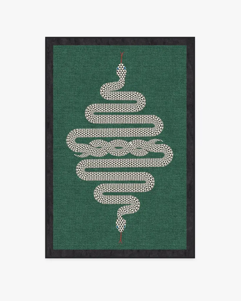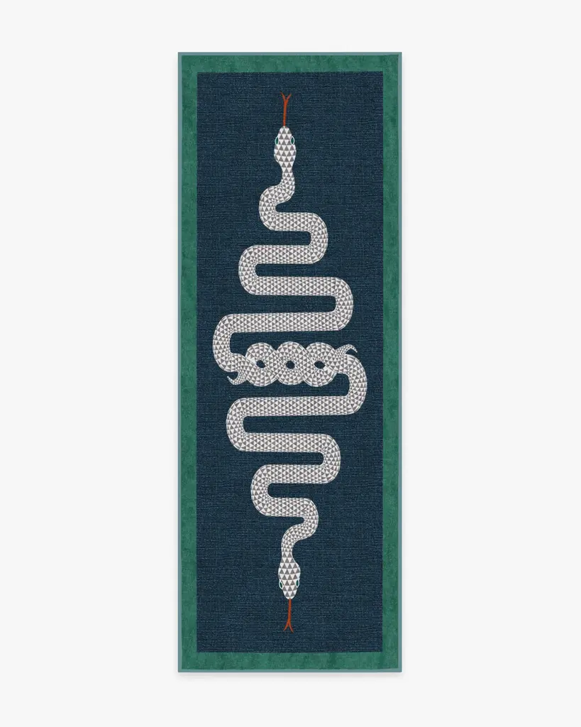 Chic and serpentine showstopper. This head-turning accent rug features two slithering serpents, intertwined on a sapphire blue background with a bottle-green border. Water-resistant, stain-resistant, and machine-washable.