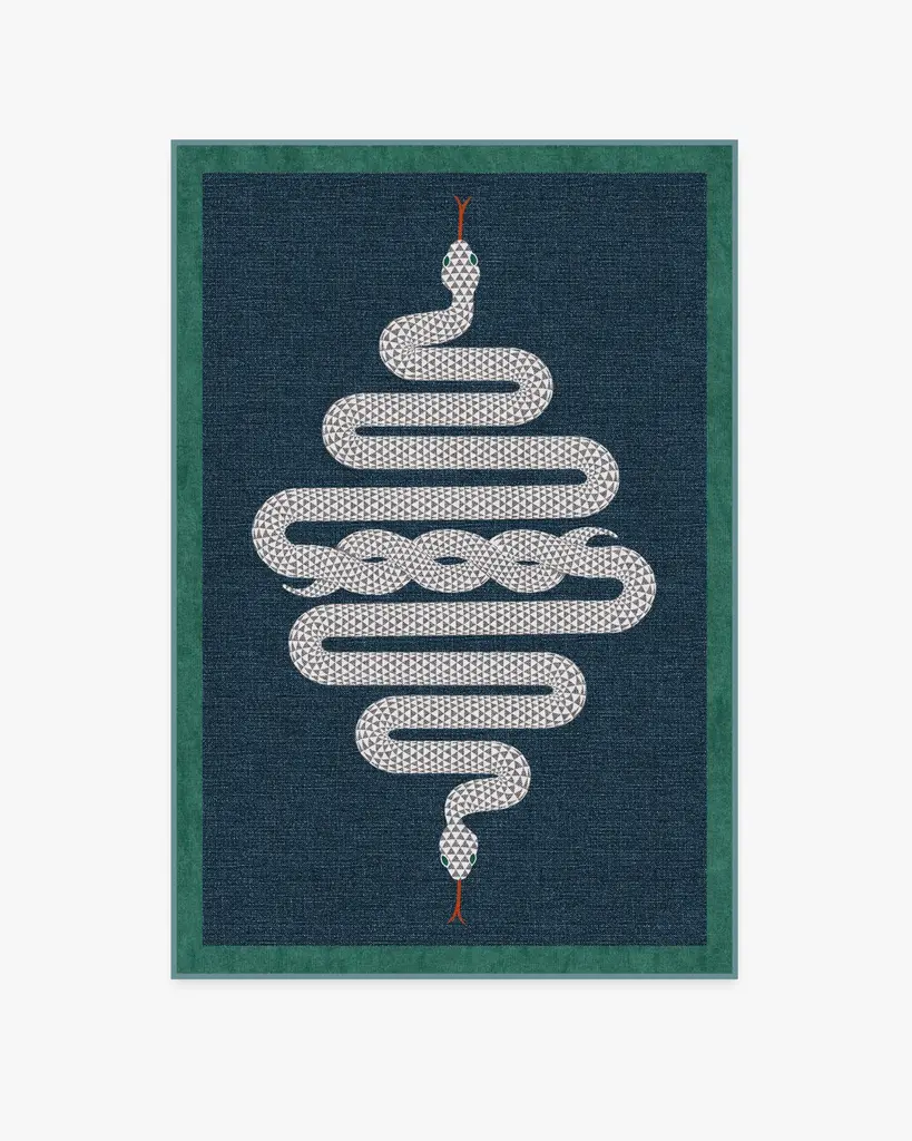 Chic and serpentine showstopper. This head-turning accent rug features two slithering serpents, intertwined on a sapphire blue background with a bottle-green border. Water-resistant, stain-resistant, and machine-washable.