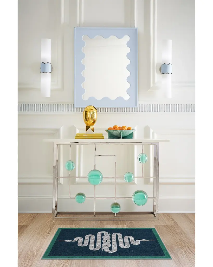 Chic and serpentine showstopper. This head-turning accent rug features two slithering serpents, intertwined on a sapphire blue background with a bottle-green border. Water-resistant, stain-resistant, and machine-washable.