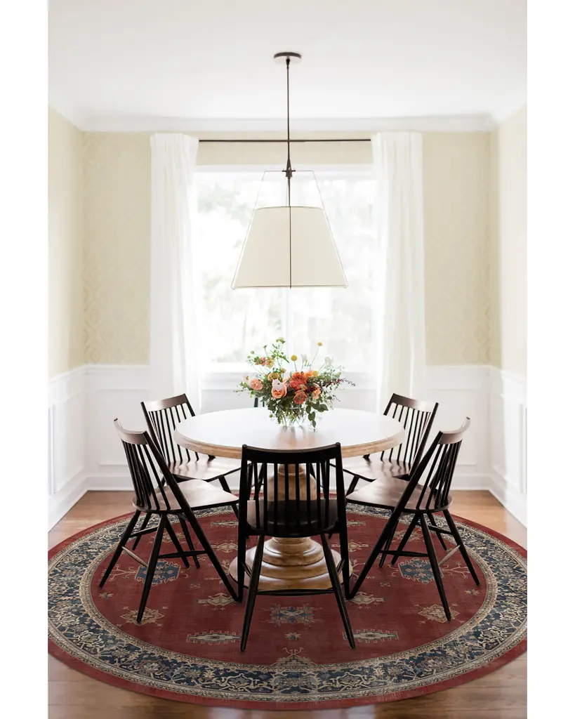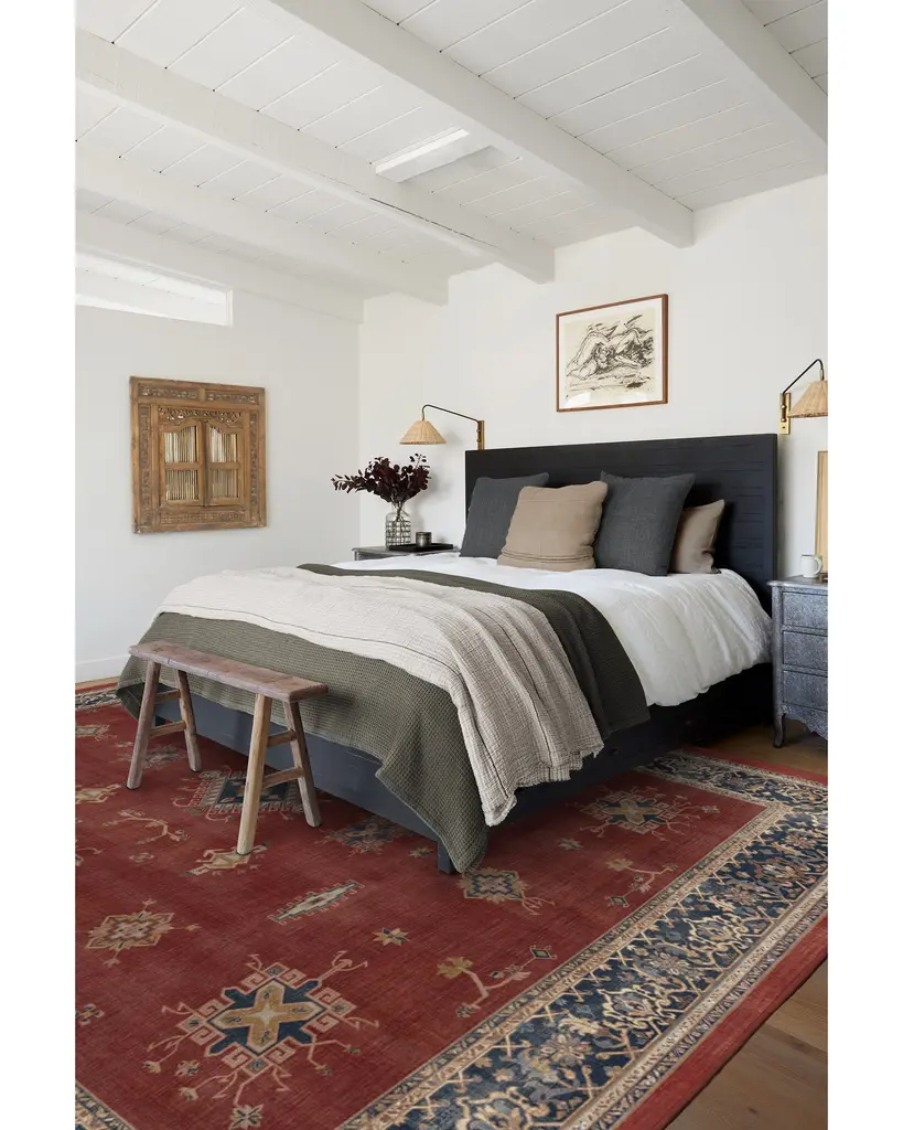 A classic Persian theme with a farmhouse feel. This rug has an ornate border around intricate gem-like shapes, which are spaciously spread out across an open field of deep rust red with navy and gold accents. Water-resistant, stain-resistant, and machine-washable.