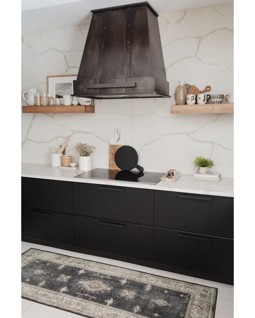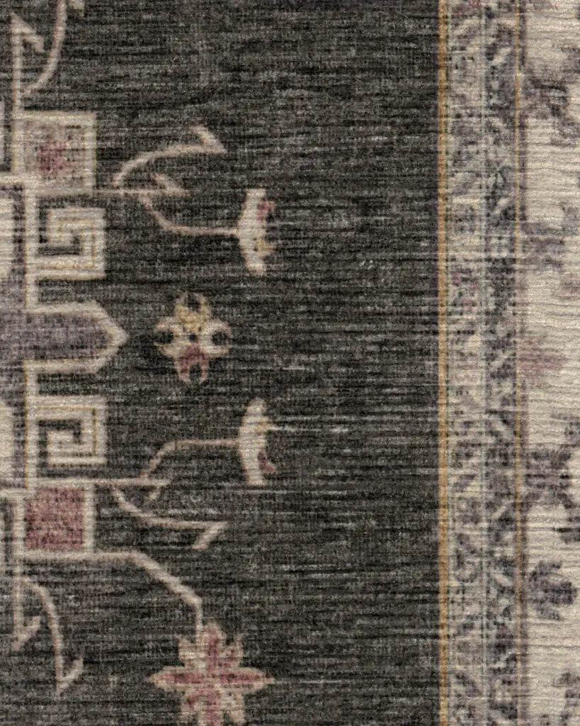 Verena Dark Wood Rug gives a classic Persian theme a modern farmhouse feel. This rug features an ornate border around intricate gem-like shapes that are spaciously spread out across an open field. Its color, a deep rustic brown that's almost black, is slightly distressed for that rustic appeal.