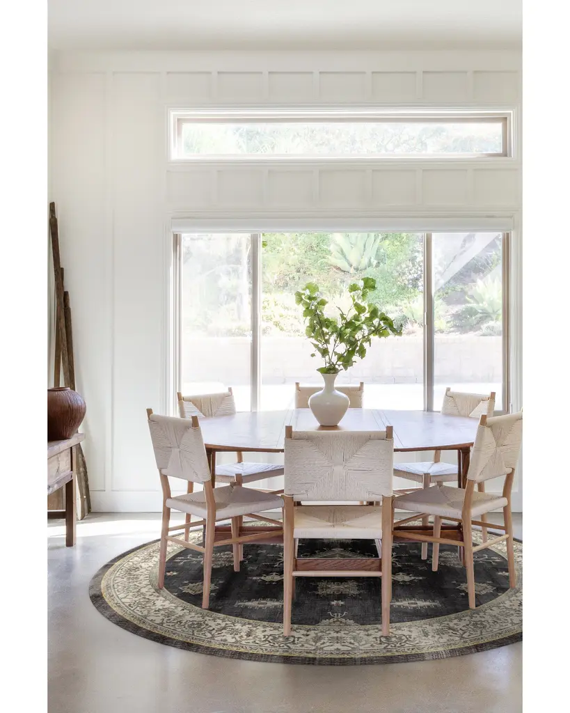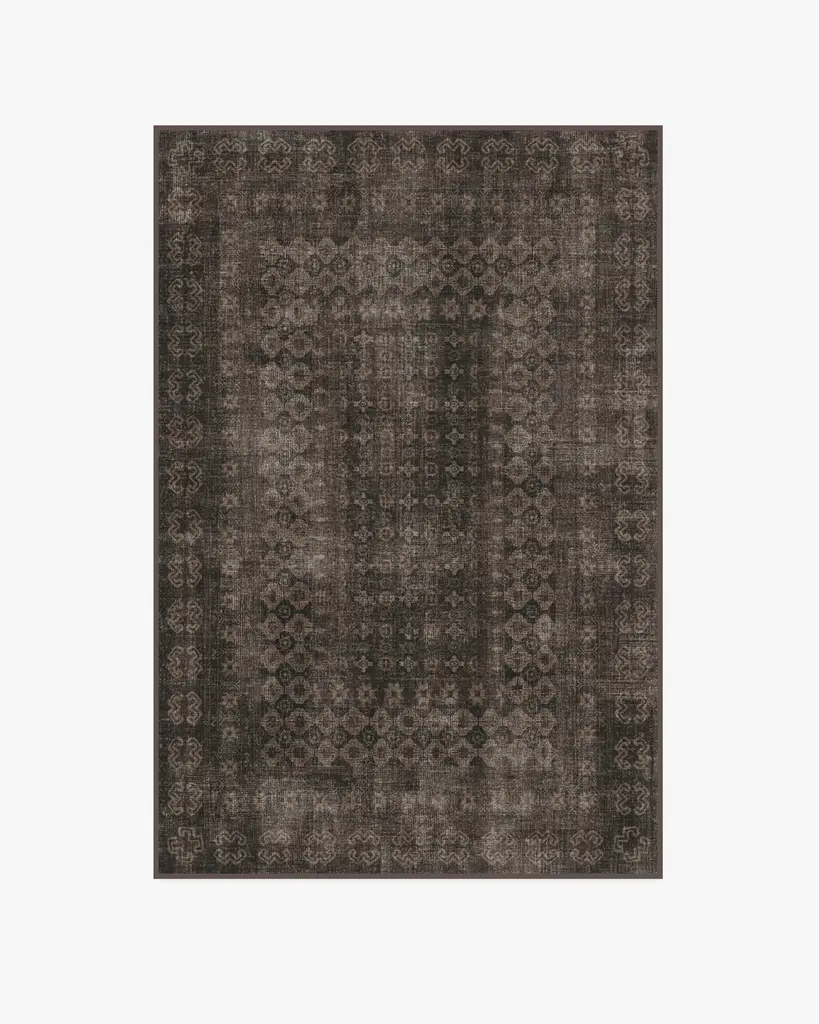 Verena Dark Wood Rug gives a classic Persian theme a modern farmhouse feel. This rug features an ornate border around intricate gem-like shapes that are spaciously spread out across an open field. Its color, a deep rustic brown that's almost black, is slightly distressed for that rustic appeal.