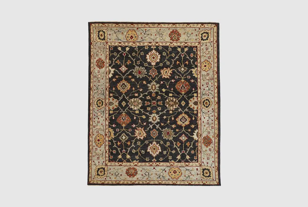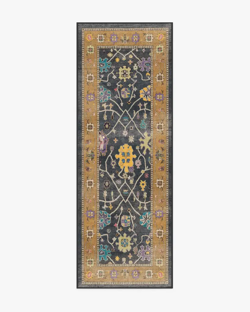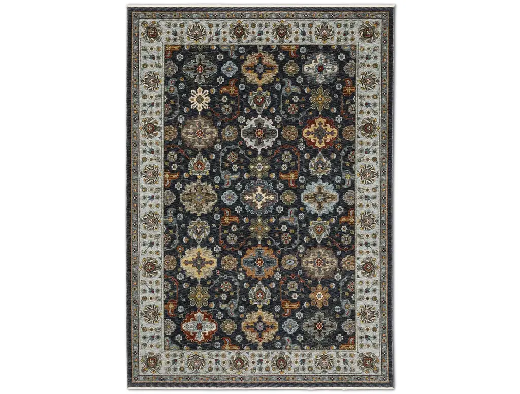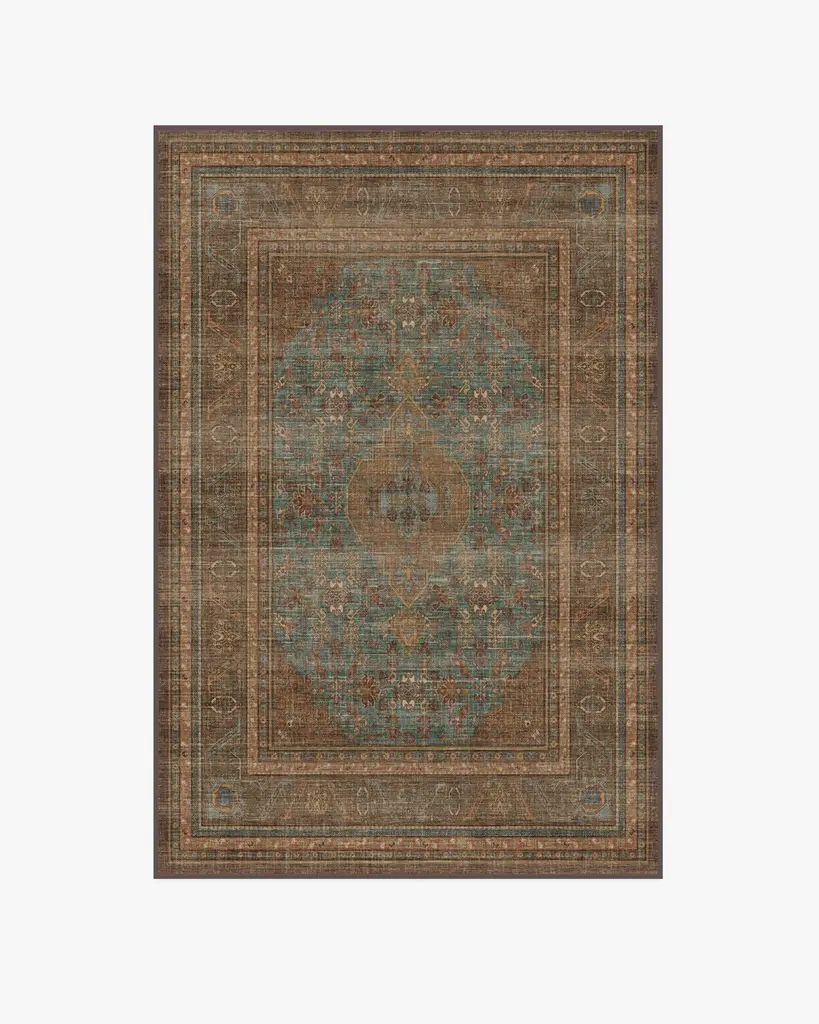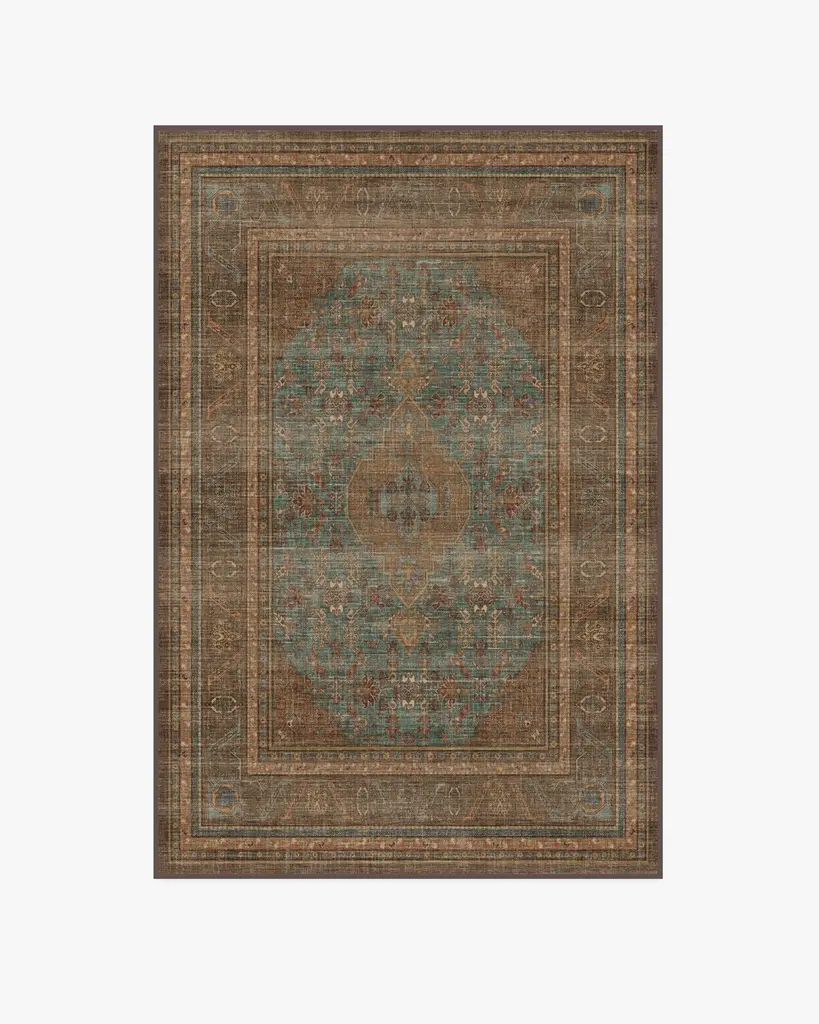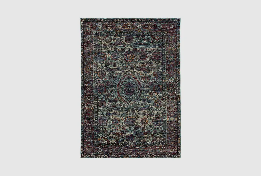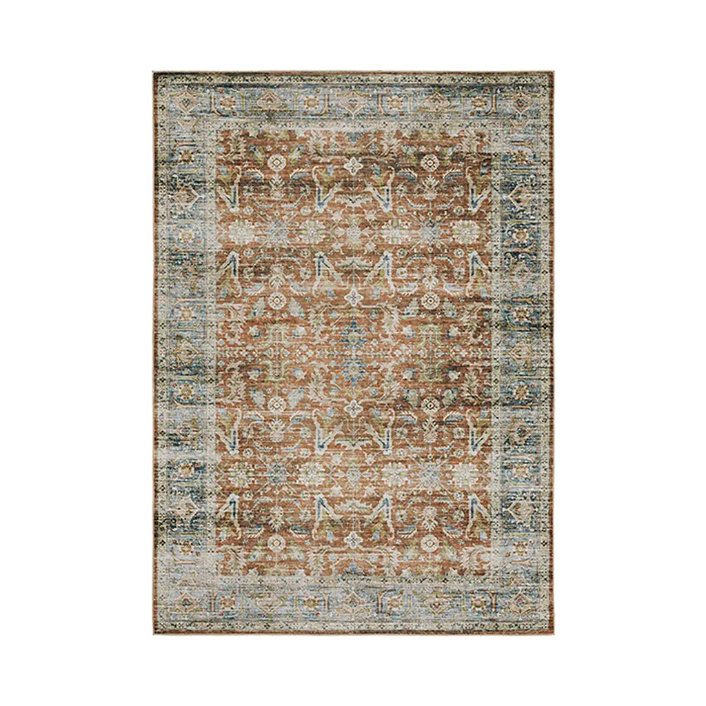 Verena Sapphire Rug puts a modern farmhouse spin on a traditional Persian-style design. Tinted in a distress-textured palette of sapphire blue, brown, and ruby red, this area rug features an ornate border around a grid of geometric shapes reminiscent of embellished jewels.