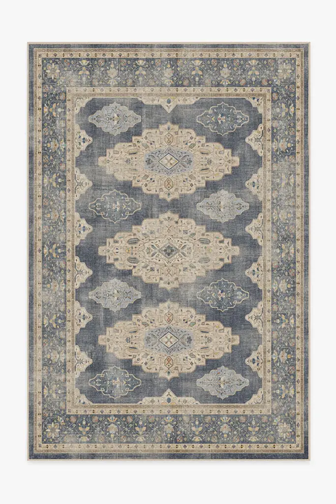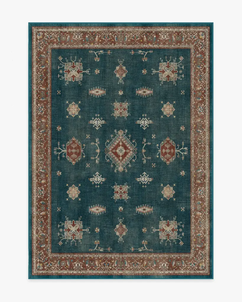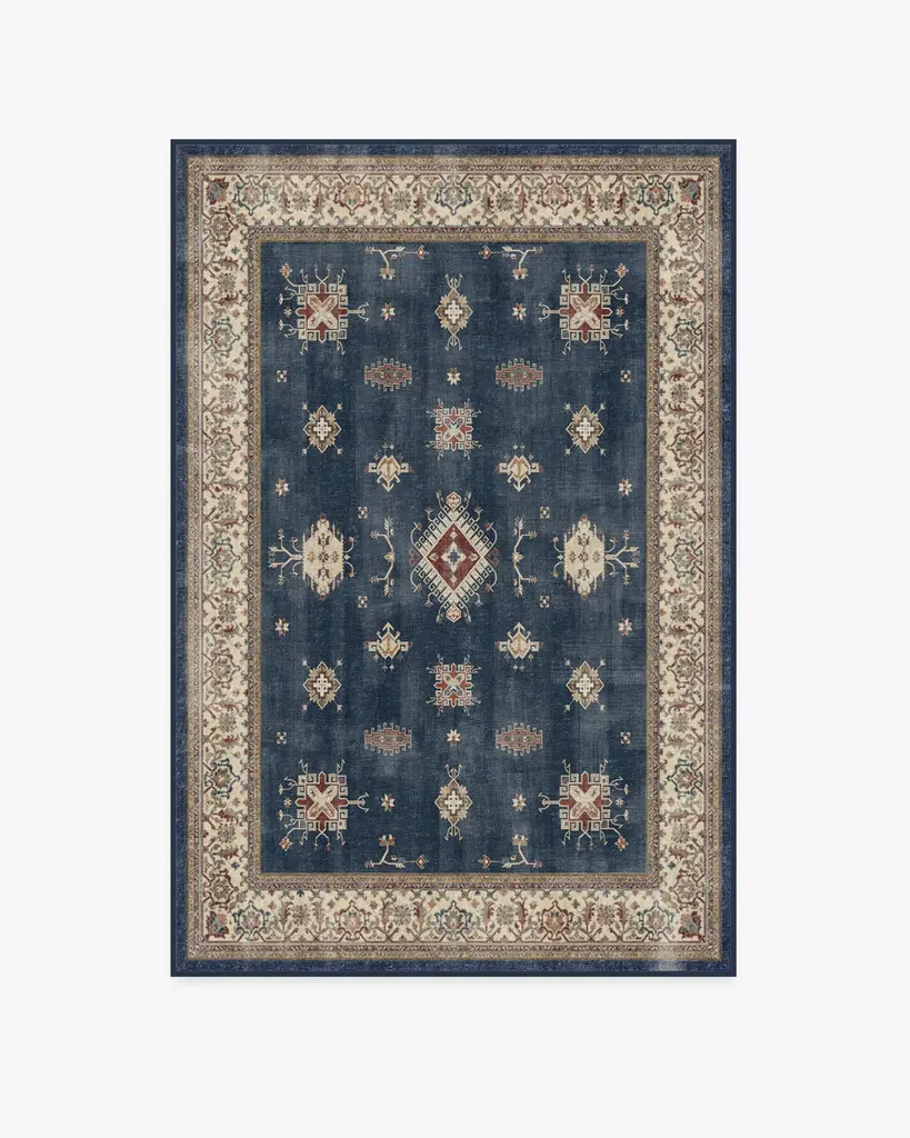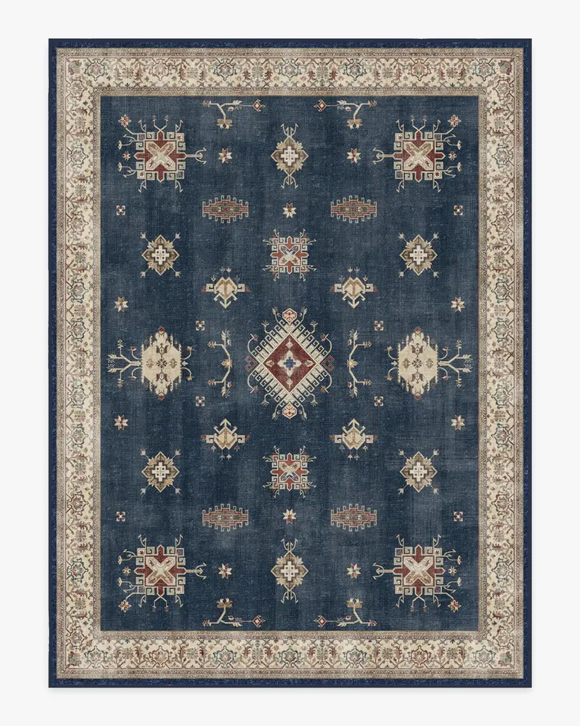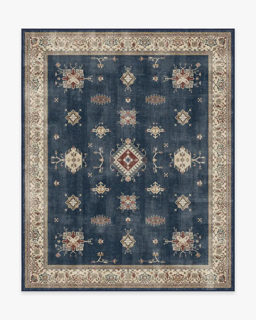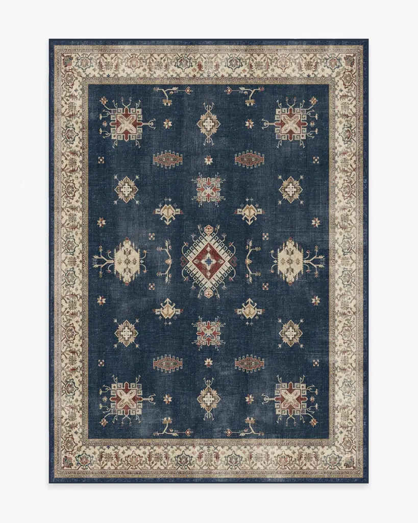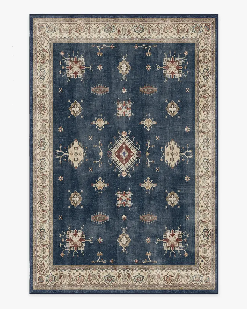 Verena Sapphire Rug puts a modern farmhouse spin on a traditional Persian-style design. Tinted in a distress-textured palette of sapphire blue, brown, and ruby red, this area rug features an ornate border around a grid of geometric shapes reminiscent of embellished jewels. Water-resistant, stain-resistant, and machine-washable.