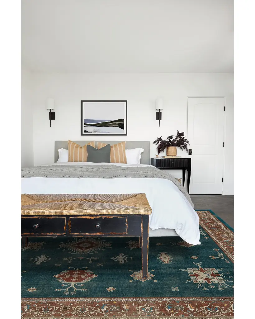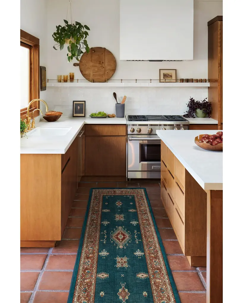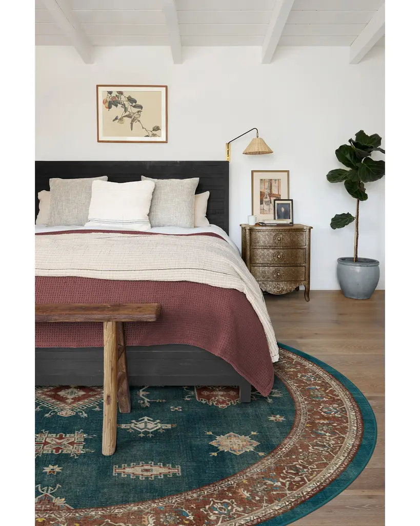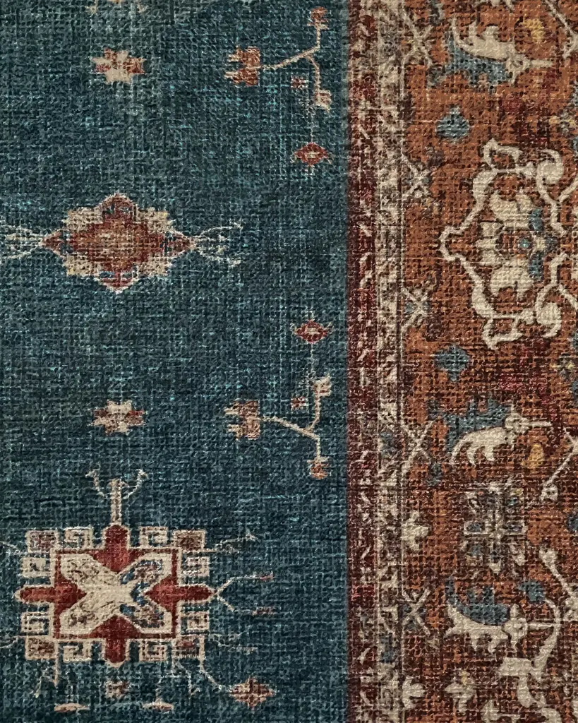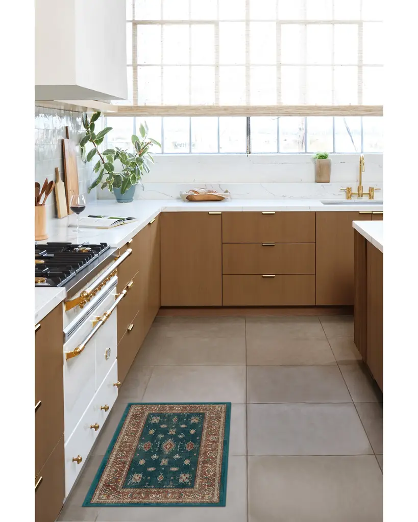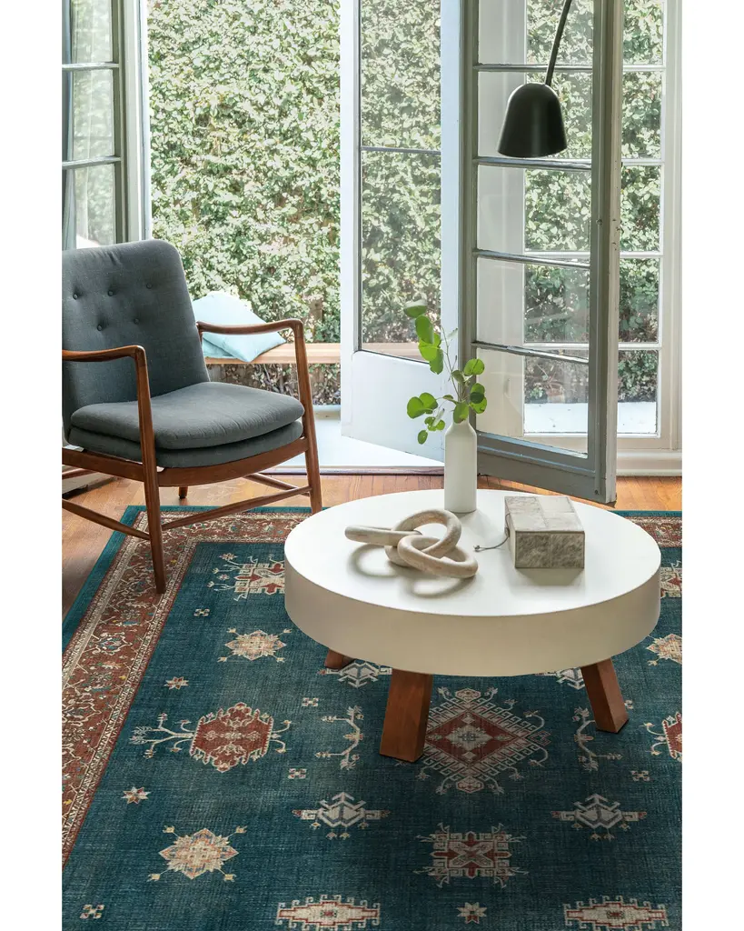 Rich and eye-catching. This rug puts a farmhouse spin on traditional Persian rug-style designs. Tinted in dark teal, rust red, coral, and beige, this distressed style rug features an ornate border around a grid of geometric gem-like shapes. Water-resistant, stain-resistant, and machine washable.