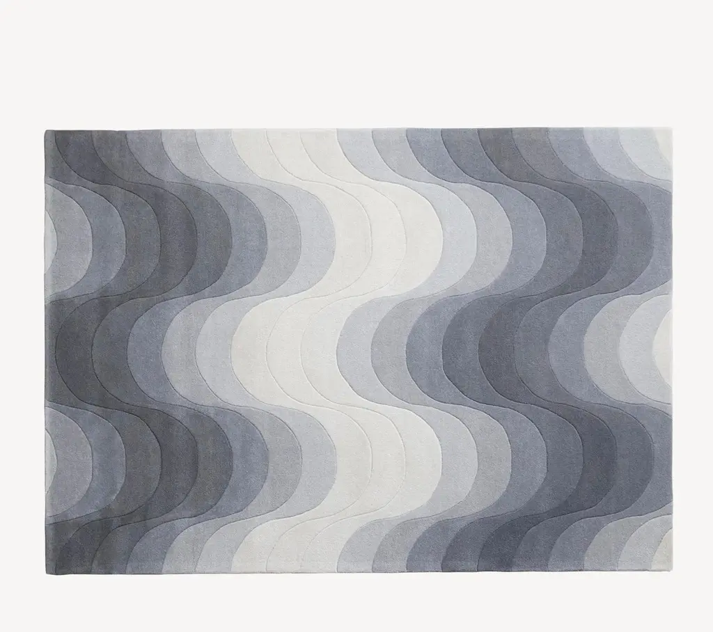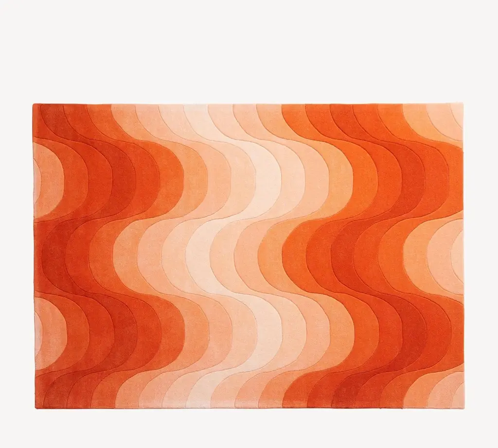 Verner Panton 'Wave' Rug 240 x 170cm for Verpan. Current production.As well as adding a sculptural feature to a room, rugs also serve to emphasize and/or transform the dimensions of the space. All Verpan carpets are made from hand-woven 100% New Zealand wool.The Wave rug features a wave pattern with gradients of grey, orange or yellow. Verner Panton (1926-1998) was an inspirational and colourful personality. A unique person with a special sense of colours, shapes, light function and room. Over the course of his career, Verner Panton (1926-1998) introduced a series of modern lamps with personalities unlike any of his Scandinavian contemporaries. With a remarkable faith in the unlimited possibilities of the form, he worked successfully to create a new set of theories about how lighting should work and how it should influence its surrounding.At DEZAAK DELUXE we try to find items that are out of the ordinary. With experience over 40 years, we are known for our singular eye and combining the new and the old. We have a few thousand items in stock in our beautiful showroom in a reclaimed factory building out of the 1930s.