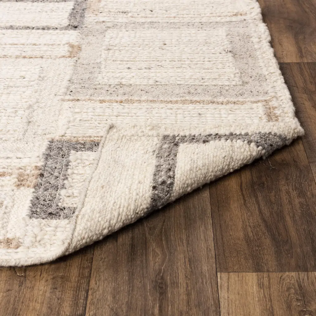 Bring interesting neutral Dhurrie drama to your transitional contemporary decor with this piece. This Dhurrie Rug is hand-woven and hand-serged with Ivory, Beige, and Grey select colors of hand-spun 90-percent wool and 10-percent cotton fibers. The look and feel of hand spun wool is unmistakable in this fine crafted Dhurrie rug. Material, construction and design come together to produce a look that is simply casual yet magnificently elegant at the same time. Make a statement in your space with this stunning rug.