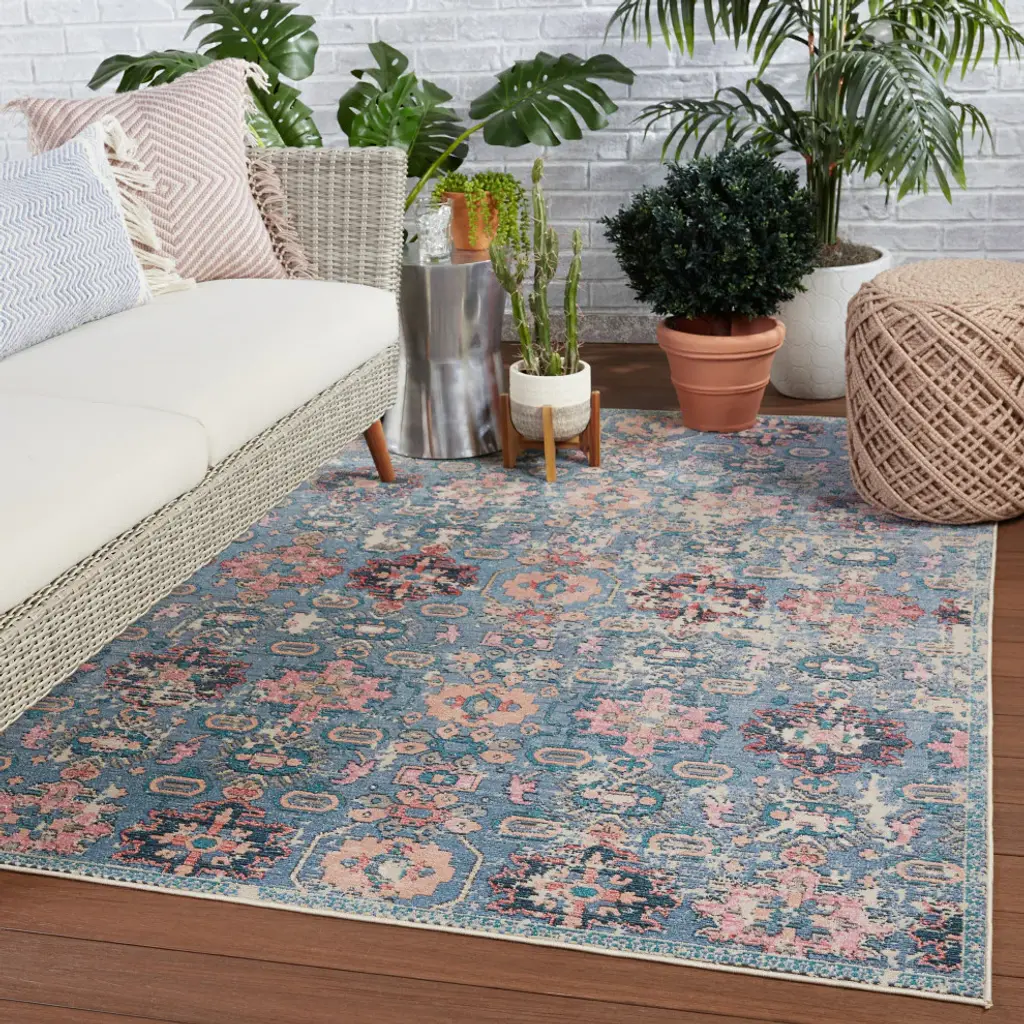 Bringing to life an enchanting and truly captivating style, the Swoon collection boasts whimsical color combinations that are vibrant and inspired by traditional Turkish textiles that have been aged in the sun for a faded and timeless look. The Farella design features vibrant hues of blue, pink, and teal for a statement-making colorway. Crafted of a soft and low-profile polyester/polypropylene blend, this performance-driven rug is perfect for homes with pets and kids or as a durable accent in outdoor seating areas.High-Performance Style: this indoor/outdoor rug is specifically designed to tolerate outdoor elements and heavy trafficWeather-Resistant Durability: made of 100% polypropylene to maximize durability in high-traffic and outdoor areasLow Pile: 0.17 inch pile with ribbed texture emulates handmade qualityCare and Cleaning: Clean or remove stains by using mild soap. Rinse with clean water or a garden hose. Hang and allow rug to dry before laying rug out. Vacuum regularly with beater bar off for indoor use.Rug Pad Recommended: allow maximum air flow and additional cushioning with an outdoor rug pad