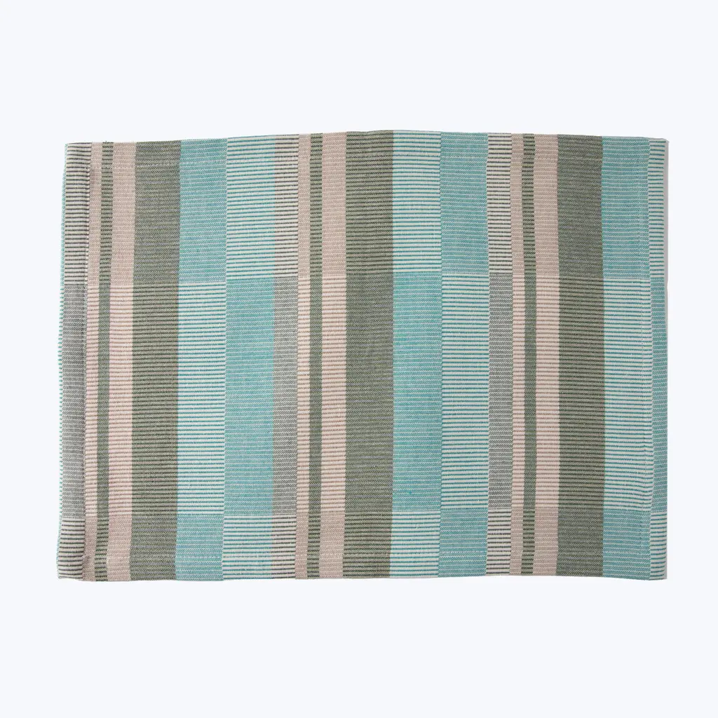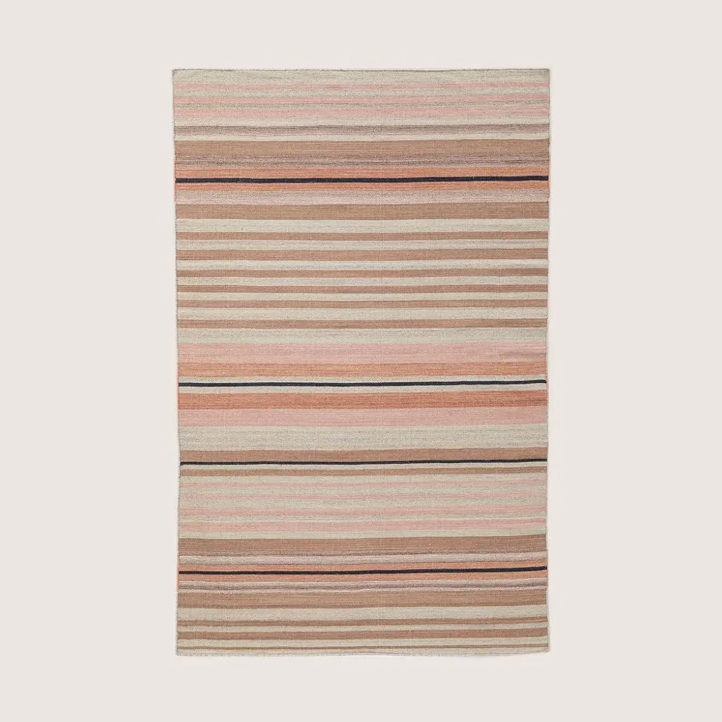 The woven Mazarro collection features a dynamic and charmingly classic cabana stripe, complemented by cool, tonal hues or chic pastel colorways. The colorful Viviana design showcases stripes of varying thickness in a playful colorway of pink, sage, gray, cream, and mauve. Crafted to withstand high-traffic areas or livable patio spaces, these stain and water-resistant, flatweave rugs are built for performance with finely woven and durable PET yarn.