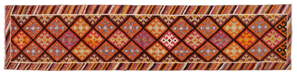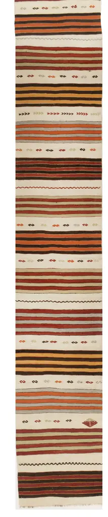 Vibrant Baneh Kelim 8 is a rectangular wool rug.Zollanvari ‘minimalist’ kilims are diverse. Baneh kilims are woven in northern regions in sections using natural undyed wools and then skilfully stitched together. The one-piece Zagros kilims woven by the Luri and Ghashgha’i nomads are monochromatic. They have traditional ‘lazy lines’ that form subtle patterns of diamonds and squares. Maryam kilims, woven by the same tribes, have plain ground colours with repeat motifs hand-embroidered in pure silk, awarded Best Innovation at the CDAs in 2009. The jewel in the crown of our ‘minimalist’ flatweaves is a collection that draws inspiration from the old and antique Mazandaran kilims that have appeared on the market in the past decade – a truly modern collection. Caprino is a new flatweave collection woven from undyed goat’s hair on which pile-knotted erratic modernist lines in bright colours are superimposed.