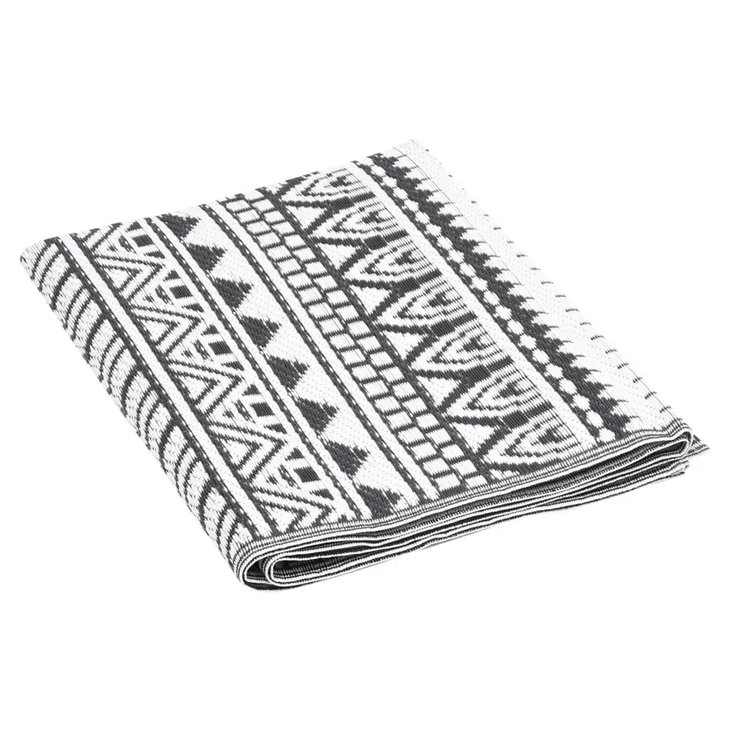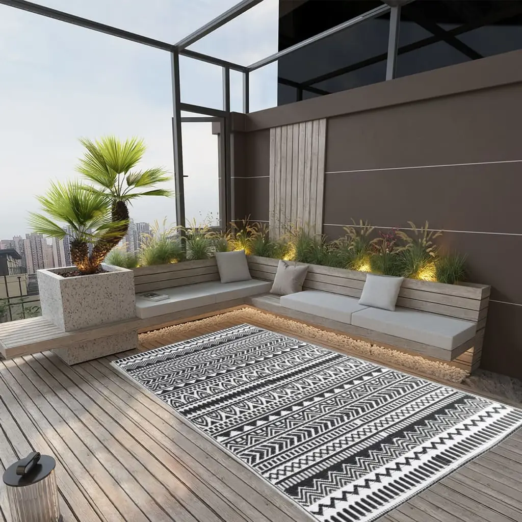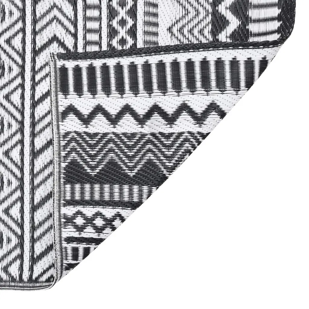 This outdoor rug is all about elegance and practicality, making it an ace addition to any balcony, terrace or outdoor space. With its gorgeous black jacquard pattern, it boosts the look of your spot while giving you a comfy place to stand. Stylish Look: The double layer jacquard pattern gives it a sophisticated vibe that fits right in with modern decor. It's a splash of luxury while staying practical for everyday use.Multi-Use: This rug works great both indoors and outdoors, perfect for any area where style meets function. Whether you're hosting friends or just chilling out, it’s a fab addition to your space.Strong Material: Crafted from top-quality polypropylene, this rug is built to withstand the weather and heavy foot traffic, so it’ll last ages. It keeps looking fab, even outdoors.Low Maintenance: Keeping this rug clean is a breeze – just brush off the dirt or give it a rinse with cold water, making it spot-on for your busy lifestyle. You'll have it looking fresh with hardly any effort.Perfect Size: At 63.0 x 90.6 in, this rug gives you tons of coverage for large outdoor areas, making comfy spots for you and your guests to relax or hang out.