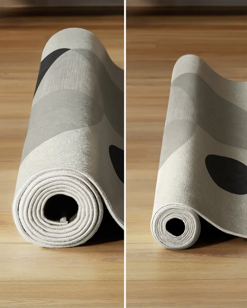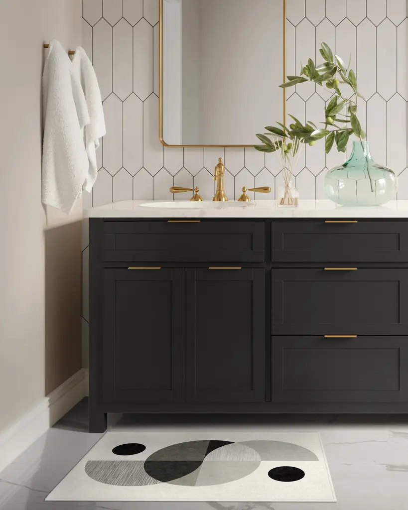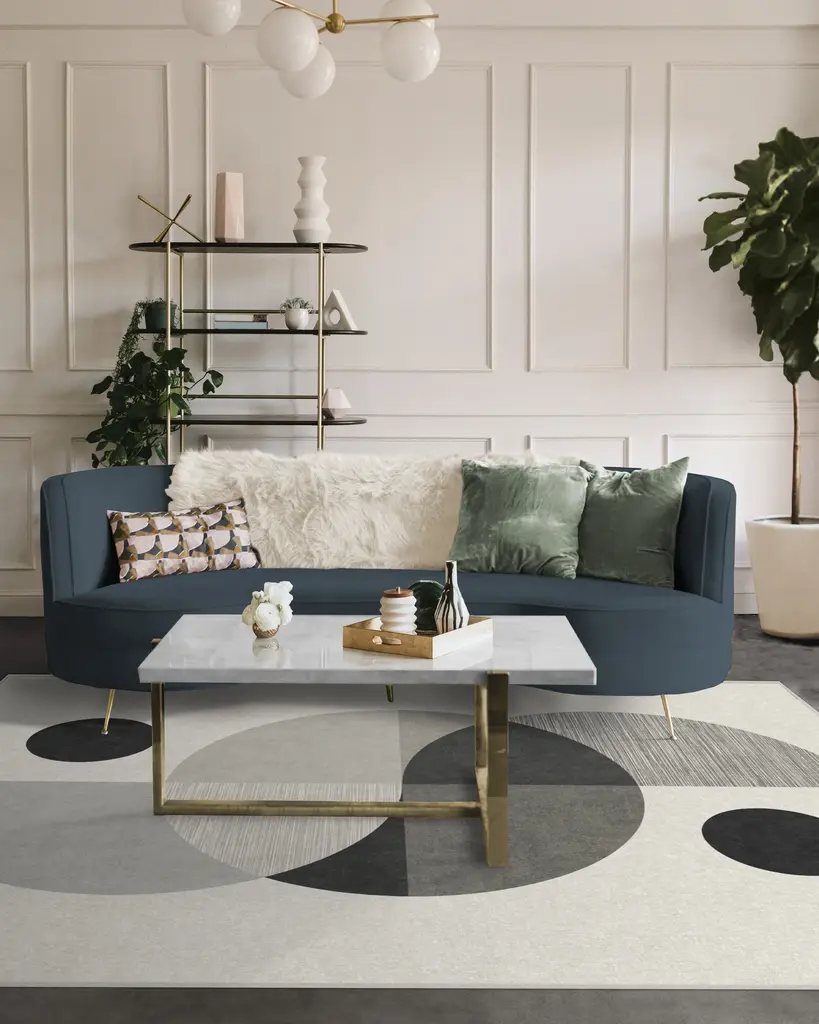 Tr������������������s chic. Named after the small French village, our Nina Takesh Villette Greyscale Rug features an art deco design in a monochromatic colorway of light, neutral, and charcoal grey on a pale grey background. Water-resistant, stain-resistant, and machine-washable.