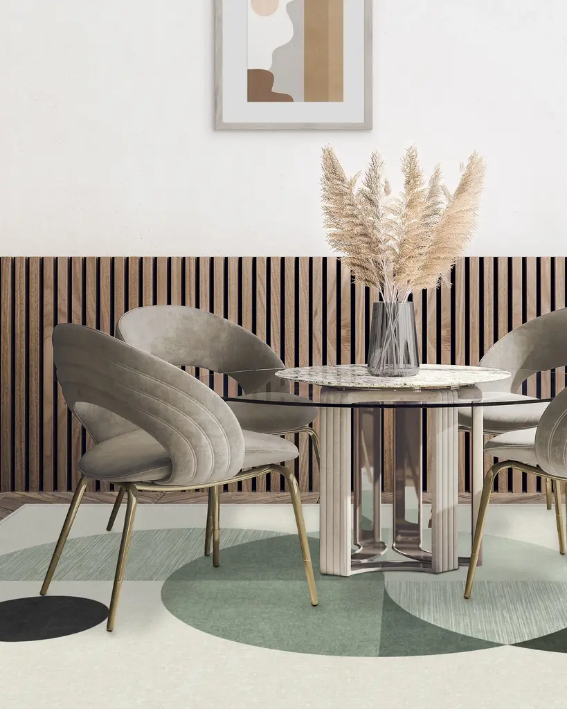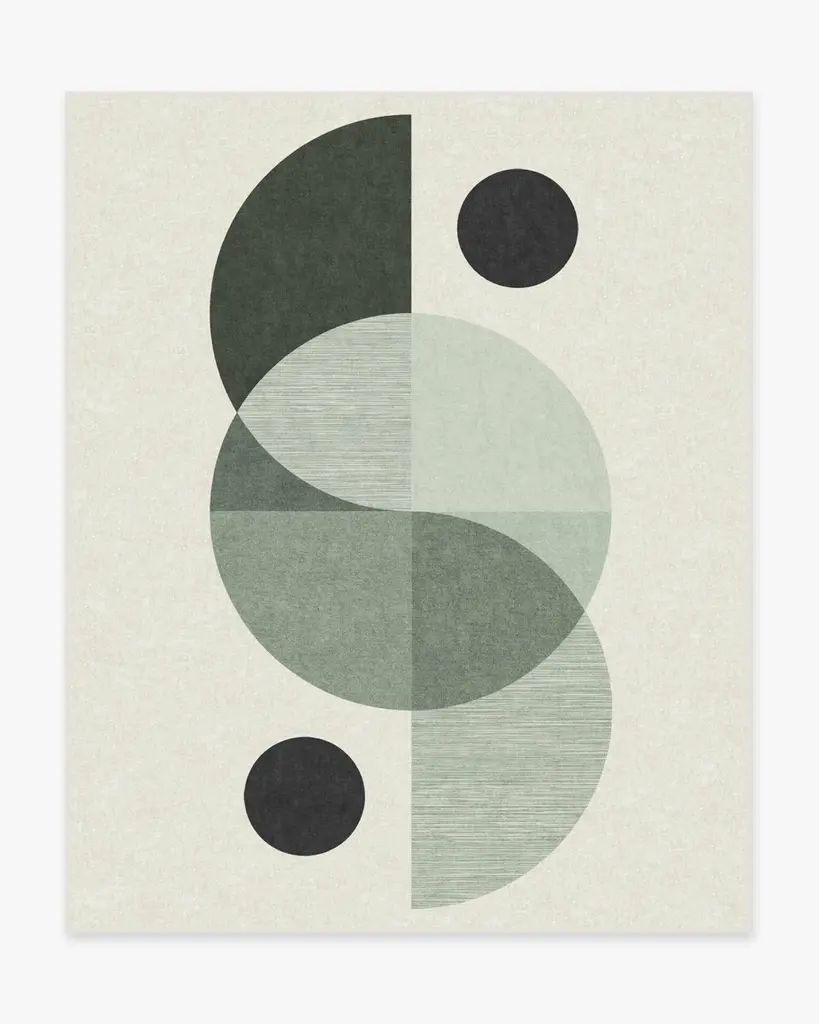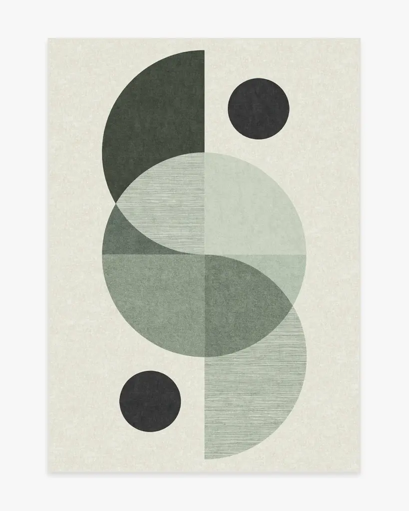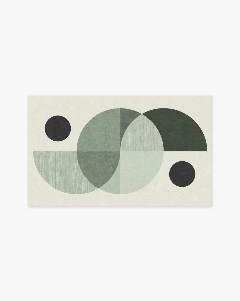 Find balance and harmony in your home. Our Nina Takesh Villette Rug, named after the French village, is inspired by iconic art deco designs and features bold, overlapping geometric shapes. The green color palette transitions from light sage to hunter green on a pearly white background. Water-resistant, stain-resistant, and machine-washable.