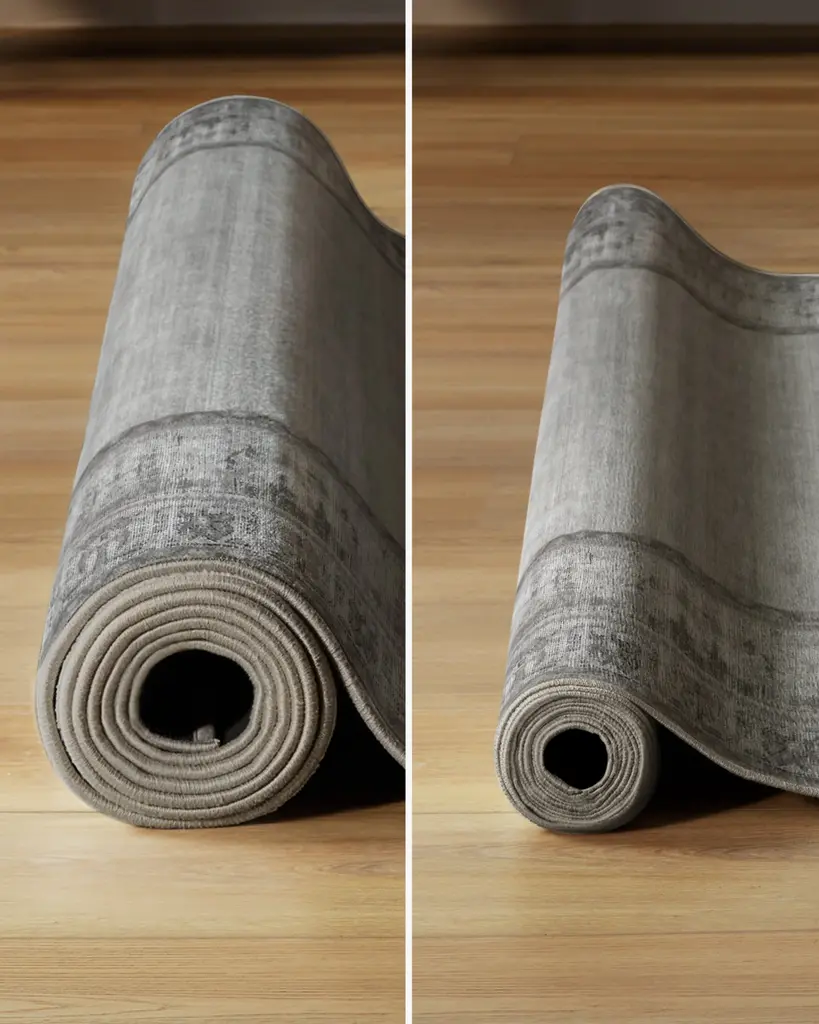 Our Vintage Daisy Bordered Grey rug will create an effortless layered effect when placed amongst your current home furnishing. Its classic border is made of keely distressed daisies with a color palette of almond milk, silver taupe, ivory, pearl and grey hues. This timeless and neutral decorative piece will elevate any contemporary, cottage, traditional or shabby chic home. Water-resistant, stain-resistant, and machine-washable. Rug colors may vary slightly according to your device and the lighting in your space.