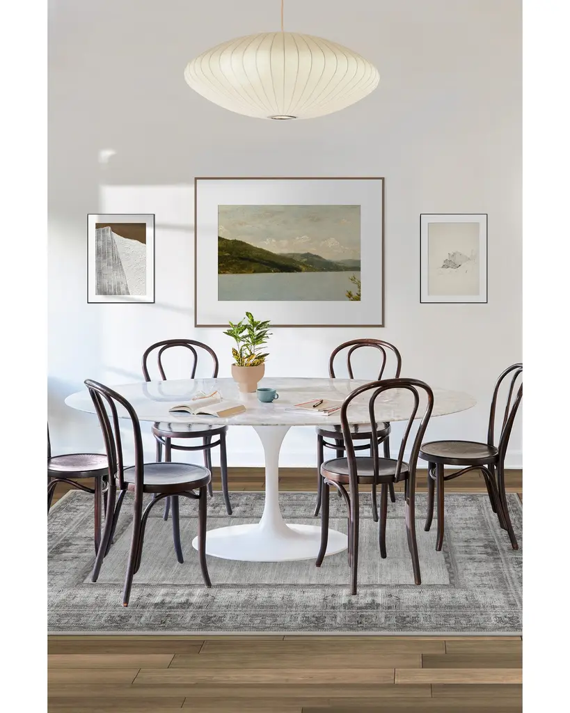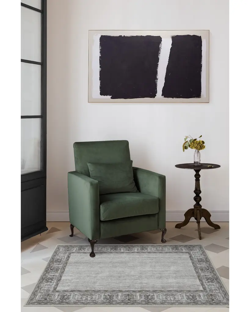 Our Vintage Daisy Bordered Grey rug will create an effortless layered effect when placed amongst your current home furnishing. Its classic border is made of keely distressed daisies with a color palette of almond milk, silver taupe, ivory, pearl and grey hues. This timeless and neutral decorative piece will elevate any contemporary, cottage, traditional or shabby chic home. Water-resistant, stain-resistant, and machine-washable. Rug colors may vary slightly according to your device and the lighting in your space.