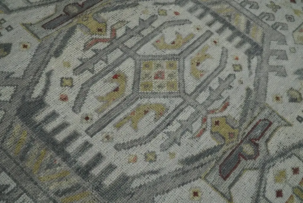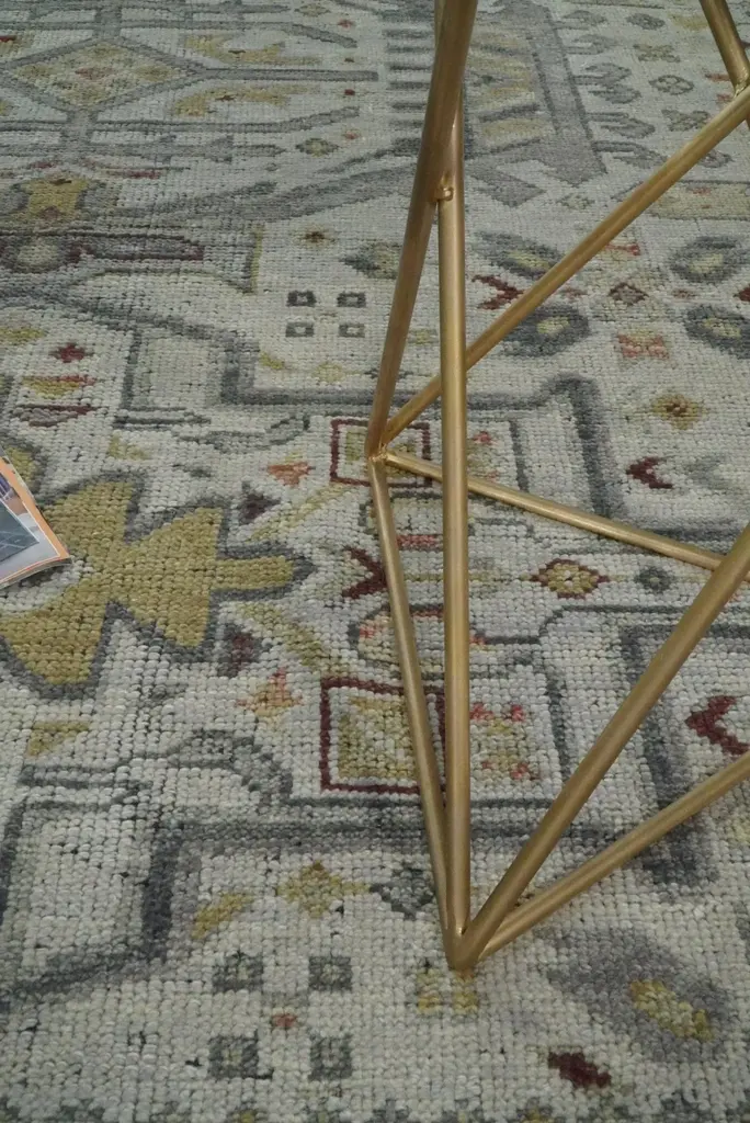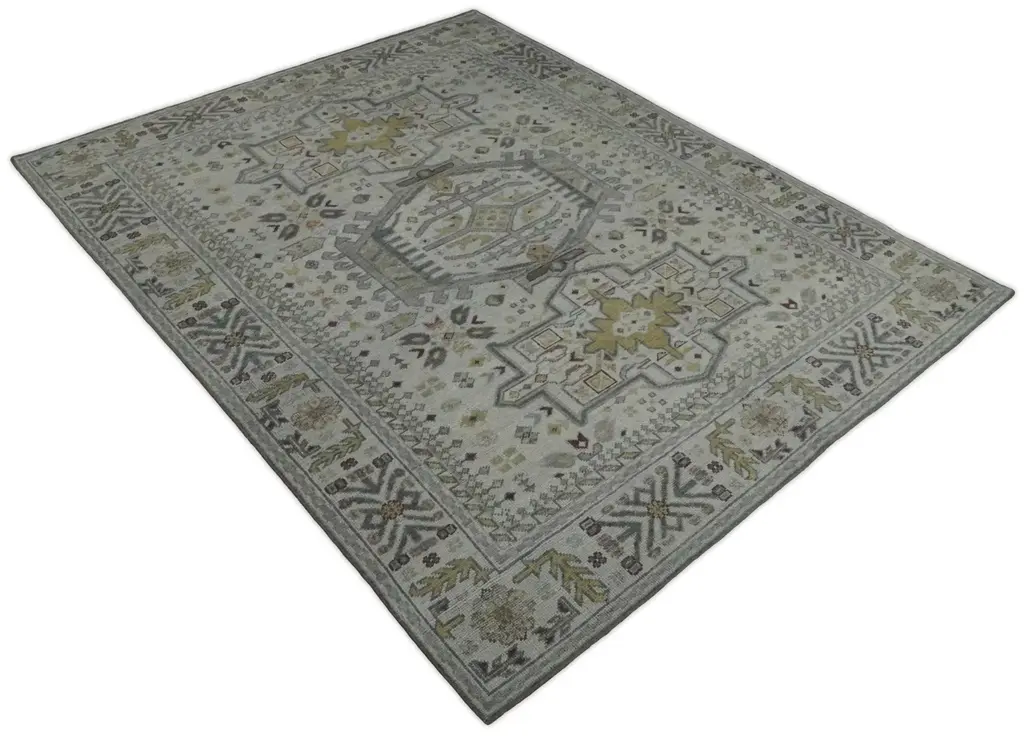 This Hand-Knotted Rug has been Made with Handspun Wool. The beautiful colors of the rug carry a legacy of the heirloom rug. The traditional design of the rug completes your space without making it look busy. Hand-Knotted rugs are durable and can last for decades if treated right. Turkish Hand-Knotted Rug MADE TO ORDER in 30-45 DAYS Made with Wool Color: Silver, Gray and Olive Soft Back as it has woolen weft Made with 25 knots per square inch This specific rug is made in India, in the city of Bhadohi. Bhadohi is one of the biggest rug manufacturing cities. Carpet weaving in the region dates back to the 16th century during the reign of Akbar. The skilled artisans of Bhadohi have been carrying the tradition of rug-making for centuries. USERS GUIDE Avoid prolonged moisture Vacuum regularly and/or shake to remove dust Do not pull any loose threads. Use scissors to simply cut the ends Blot spills immediately with a white cloth. Harsh chemicals may damage or fade the rug Use rug protectors under heavy furniture