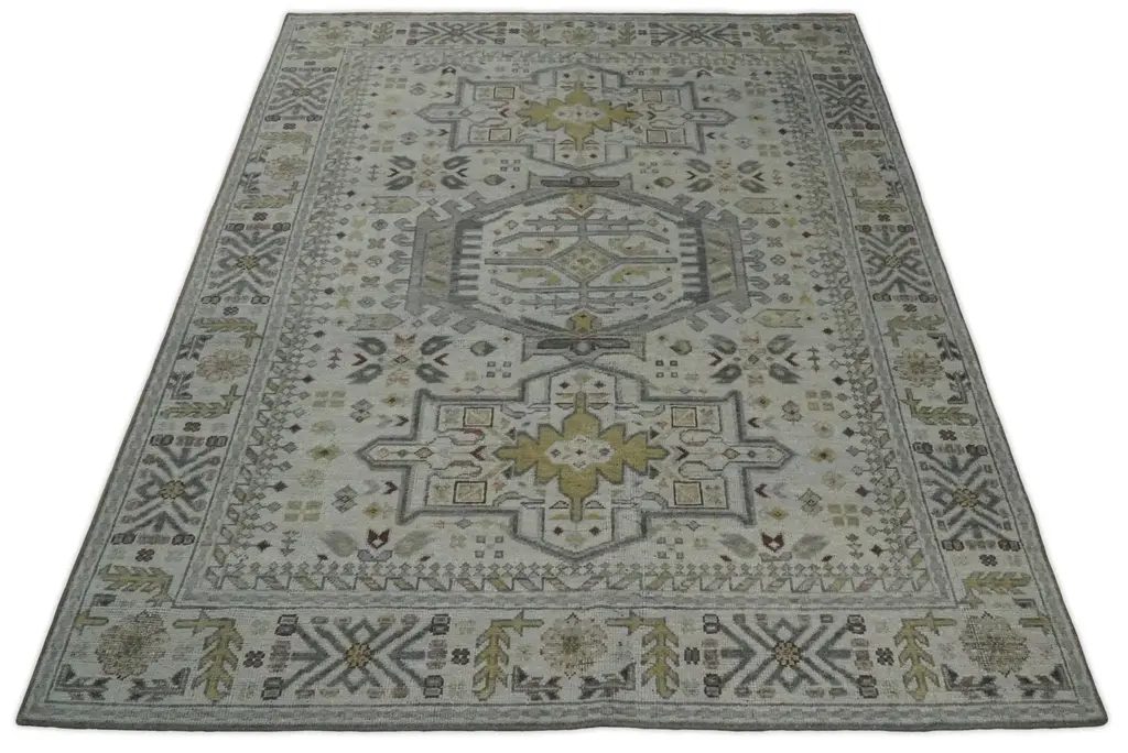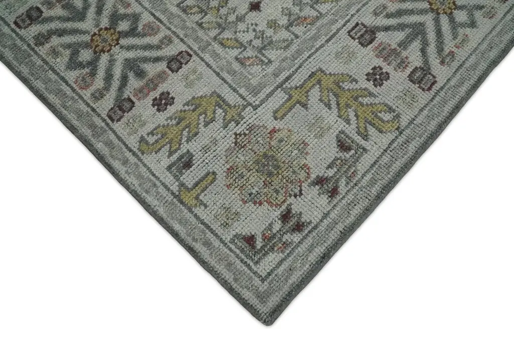 This Hand-Knotted Rug has been Made with Handspun Wool. The beautiful colors of the rug carry a legacy of the heirloom rug. The traditional design of the rug completes your space without making it look busy. Hand-Knotted rugs are durable and can last for decades if treated right. Turkish Hand-Knotted Rug MADE TO ORDER in 30-45 DAYS Made with Wool Color: Silver, Gray and Olive Soft Back as it has woolen weft Made with 25 knots per square inch This specific rug is made in India, in the city of Bhadohi. Bhadohi is one of the biggest rug manufacturing cities. Carpet weaving in the region dates back to the 16th century during the reign of Akbar. The skilled artisans of Bhadohi have been carrying the tradition of rug-making for centuries. USERS GUIDE Avoid prolonged moisture Vacuum regularly and/or shake to remove dust Do not pull any loose threads. Use scissors to simply cut the ends Blot spills immediately with a white cloth. Harsh chemicals may damage or fade the rug Use rug protectors under heavy furniture