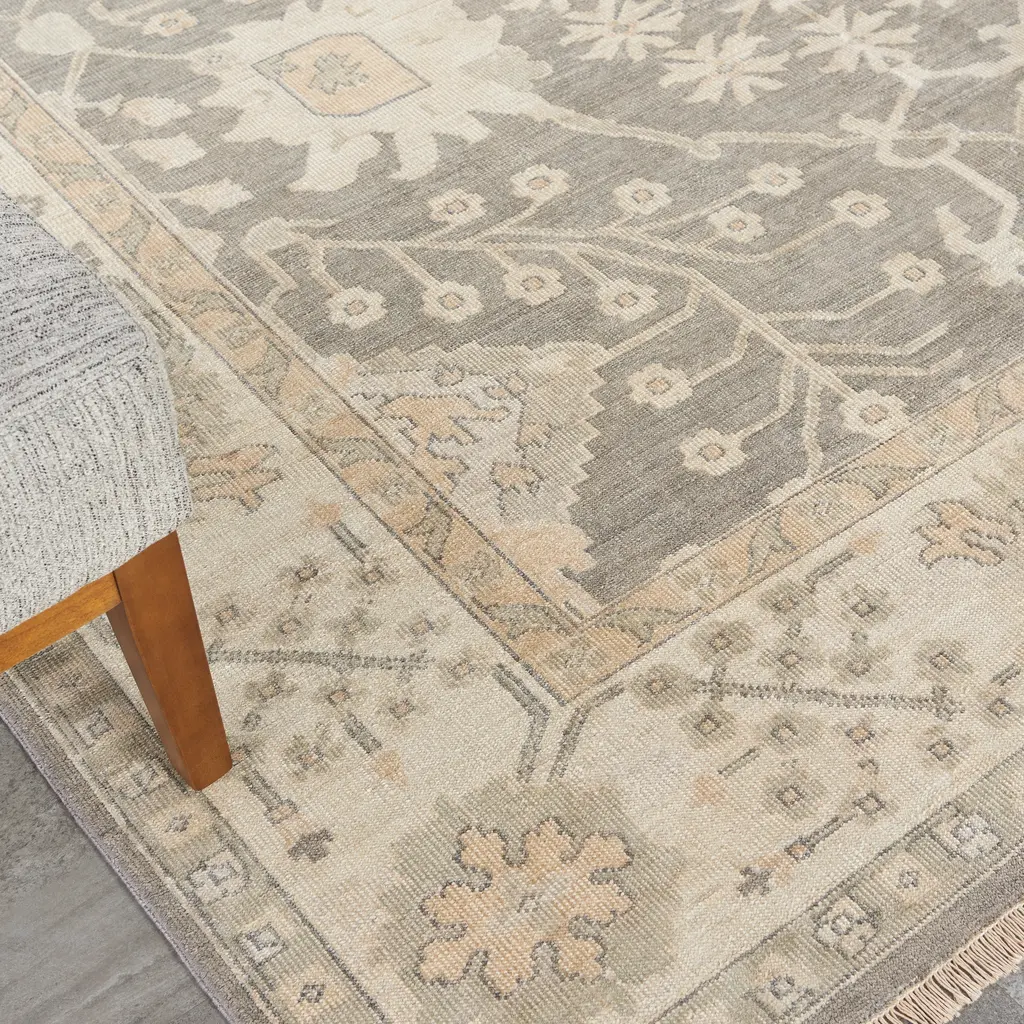 Austere elegance lies in the Vintage Essentials Style Rug in Pewter. Commanding attention with its dimensions of 5'6" x 8', it stretches luxuriously across floors, anchoring living rooms, dining areas, or expansive bedrooms. The dominant pewter gray weaves a tale of sophistication, a perfect backdrop that doesn't boast yet insists on being noticed. A medallion commands the heart of this textile masterpiece, encircled by delicate floral and vine motifs that journey gracefully across the landscape of the rug. Bound by a broad, contrasting border laced with lighter cream and beige, the rug carries whispers of faded peach and blush pink—each stroke ghosting over the flowers with a gentle, antique allure. This subtle fading lends the rug an aged benevolence, as if lovingly passed down through generations. Crafted from bamboo-extracted fibers that mimic silk, the rug offers a sumptuous underfoot experience. This blend provides silk’s visual splendor and a subtle gleam, partnered with durability to withstand the cadence of daily existence. Its buttery texture luxuriates in variable lighting, shifting moods in quiet, elegant waves. Born from Indian looms, the rug carries the imprints of tradition and artisanal rigor, a testimony to quality and resilience. The rug’s pewter tones nestle seamlessly into both classic and transitional interiors, serving as the quiet hero of any decor. It grounds spaces with innate warmth and structure, a versatile palette that complements existing aesthetics while offering comfort and style a new dimension.