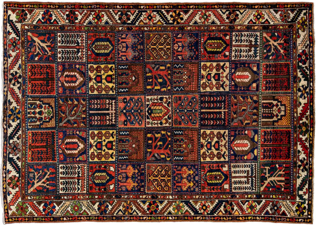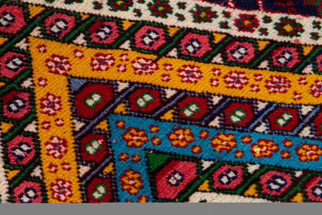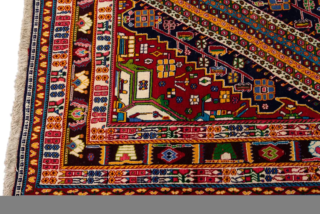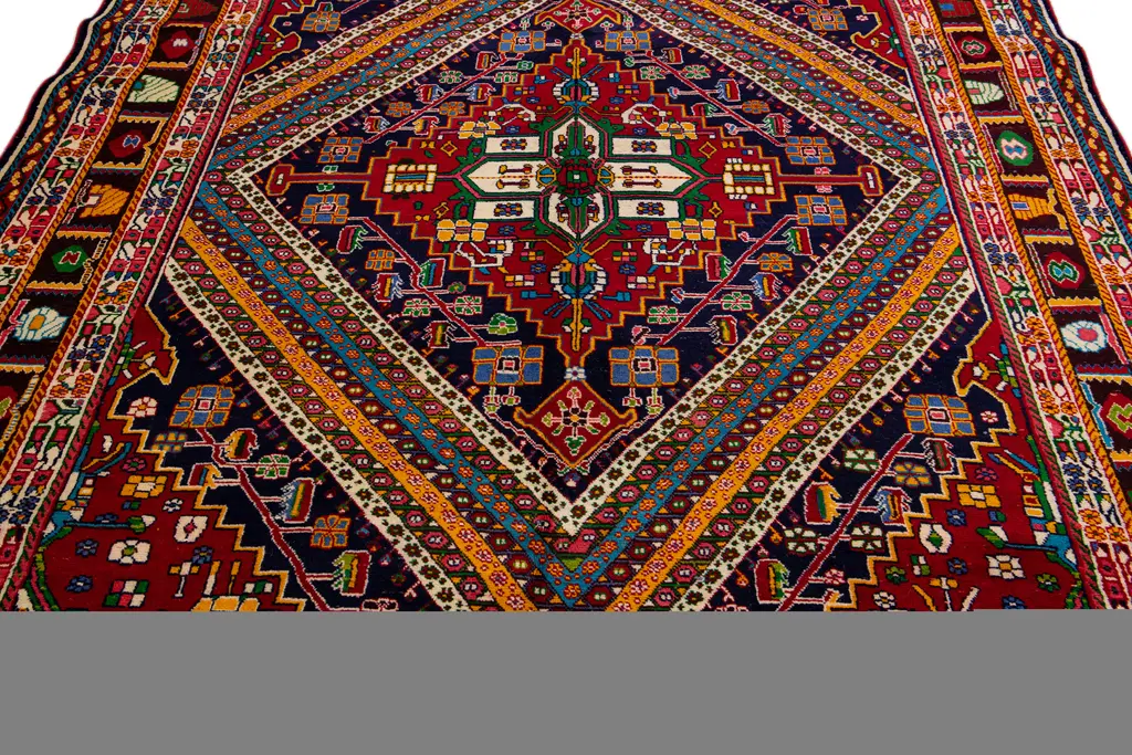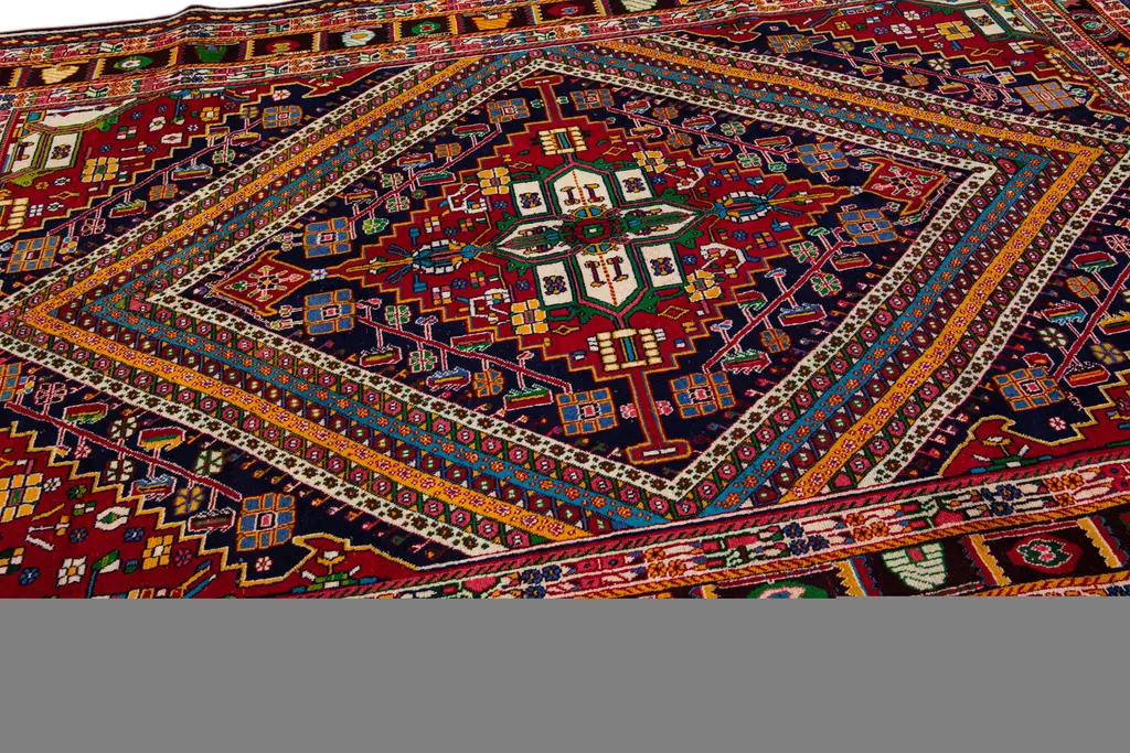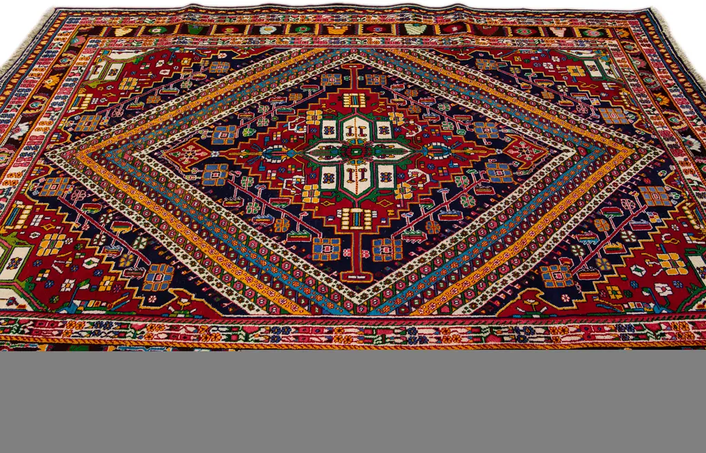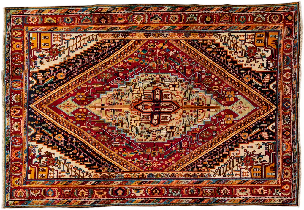 Beautiful Vintage Shiraz hand-knotted Wool rug with the red field. This Shiraz rug has a multicolor accents in all over geometric design. This rug measures: 6'8" X 9'11".