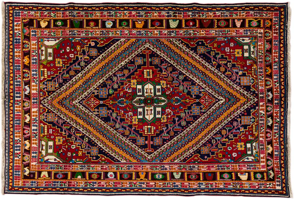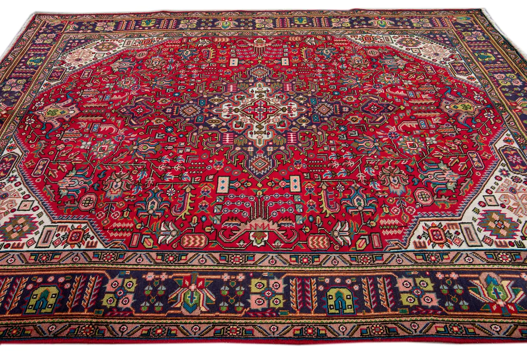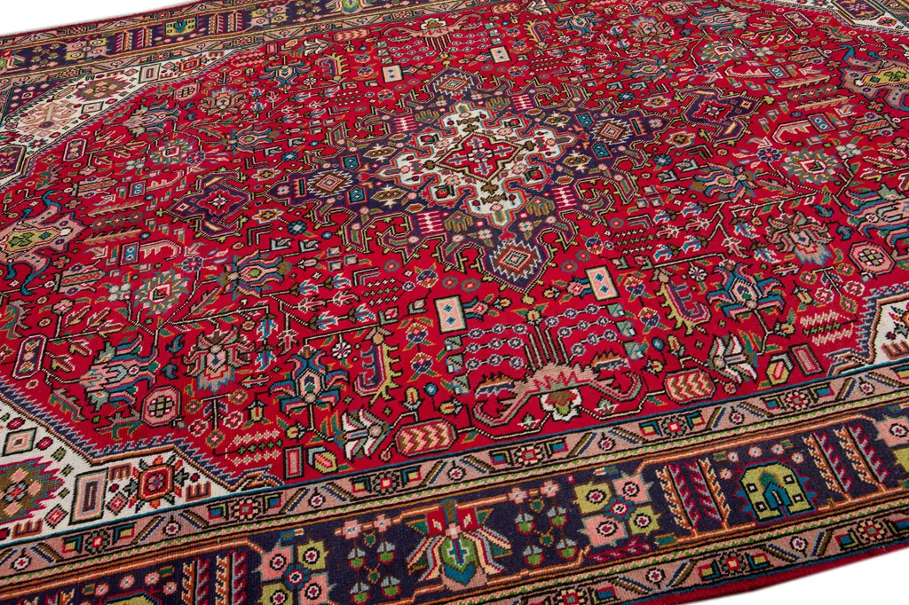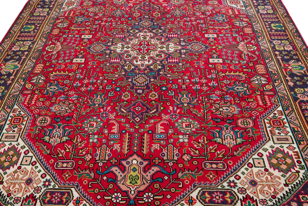 Beautiful Vintage Persian hand-knotted Wool rug with the red field. This Persian rug has a multicolor accents in all over medallion design. This rug measures: 6'9" X 9'8".
