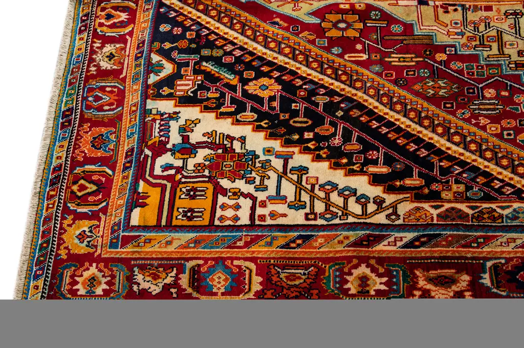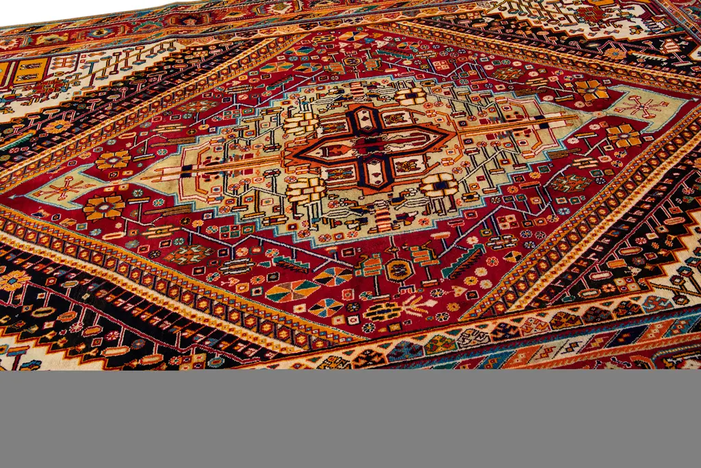 Beautiful Vintage Shiraz hand-knotted Wool rug with the red field. This Shiraz rug has a multicolor accents in all over medallion design. This rug measures: 6'8" X 9'11".