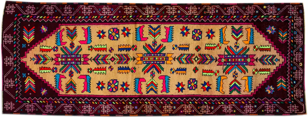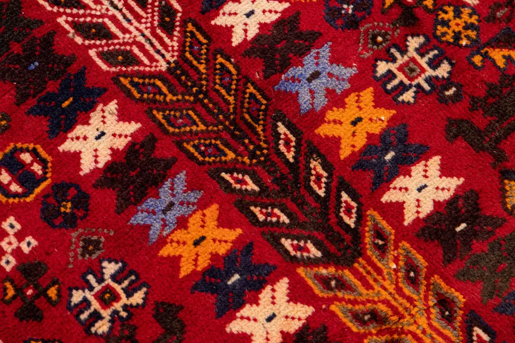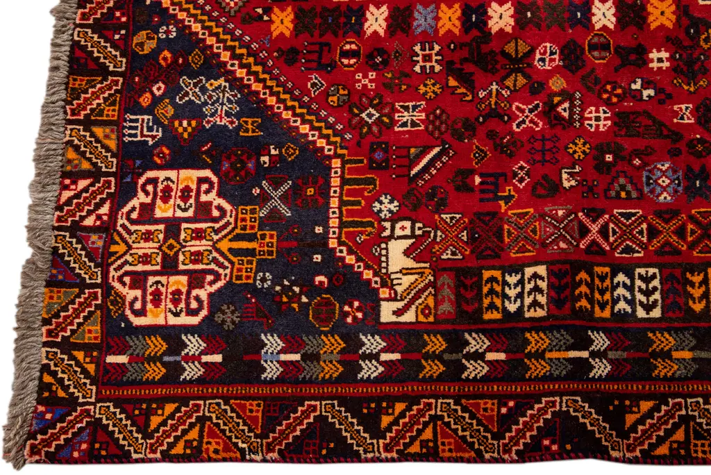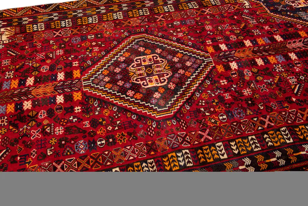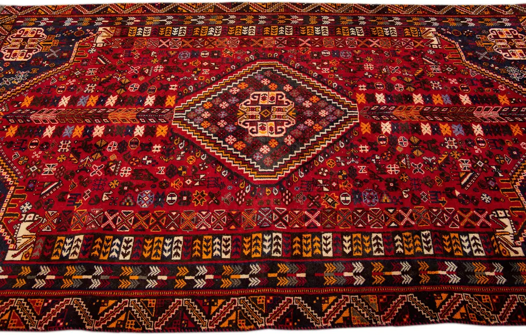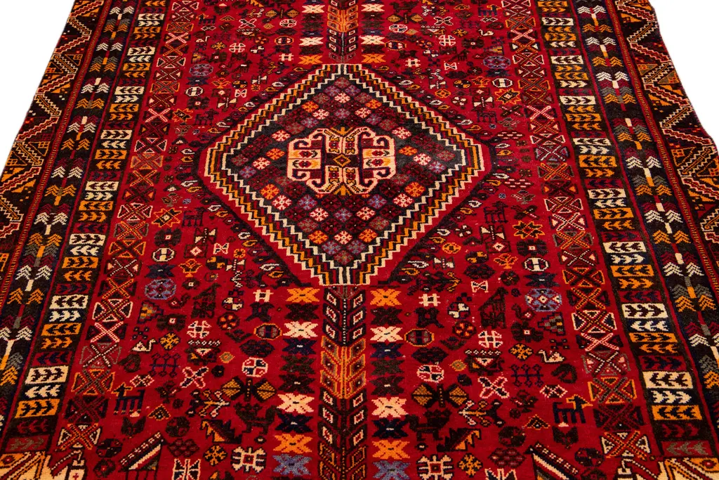 Beautiful Vintage Shiraz hand-knotted Wool rug with the red field. This Shiraz rug has a multicolor accents in all over medallion design. This rug measures: 5'2" X 10'5".