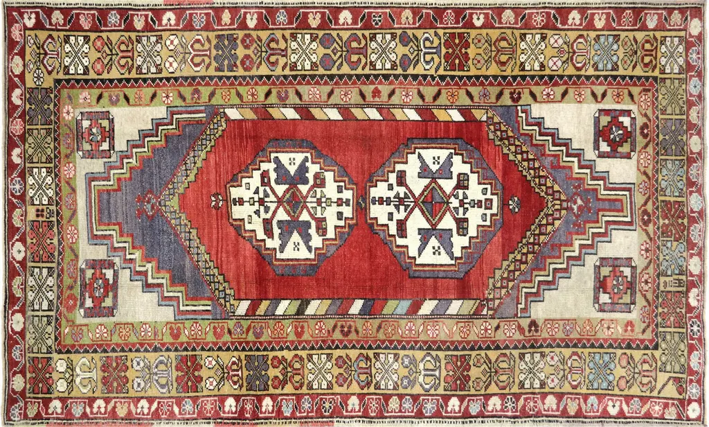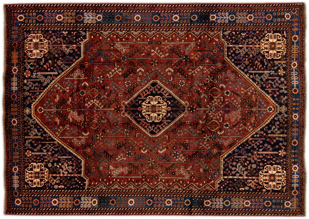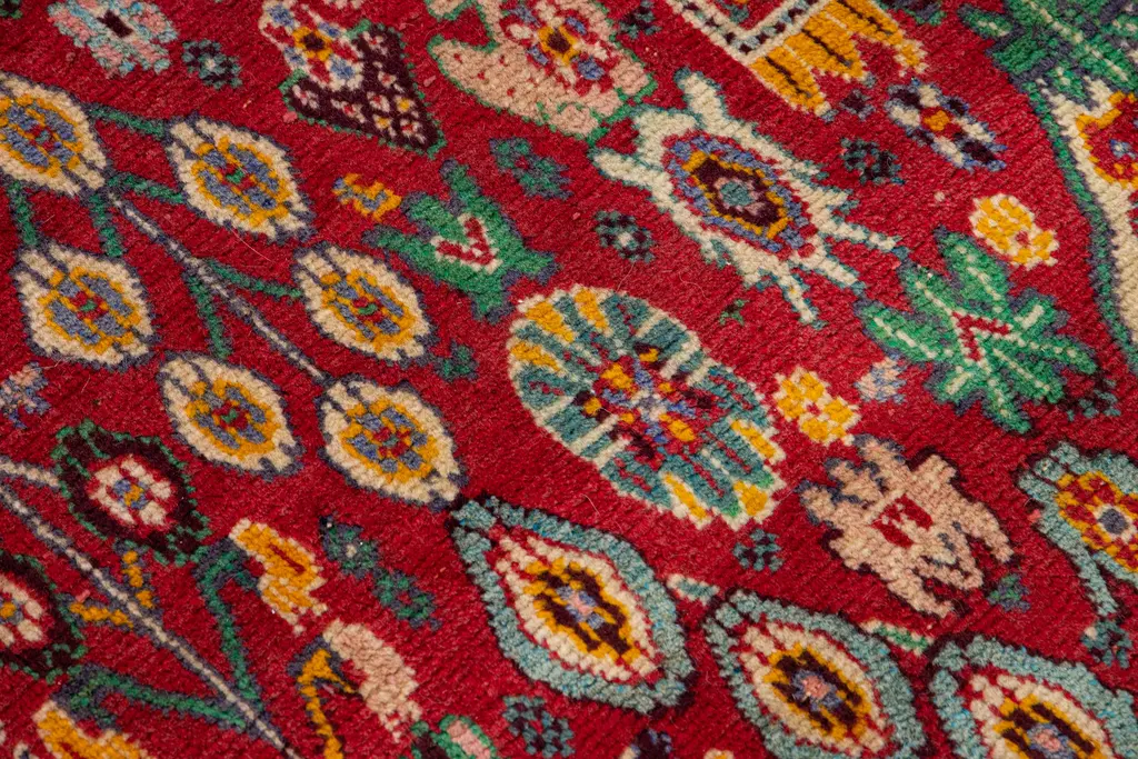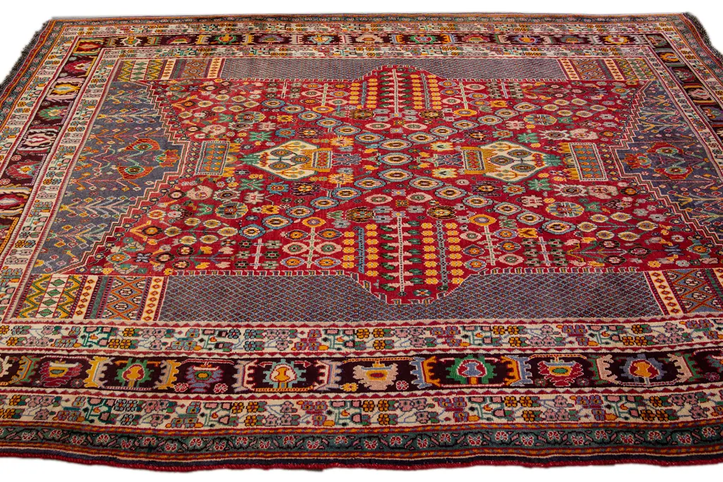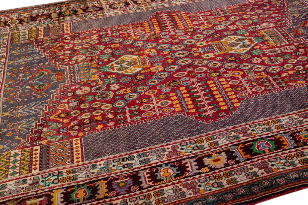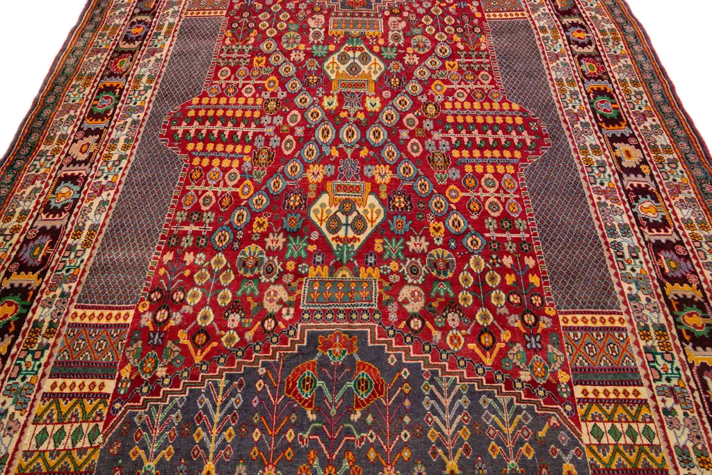 Beautiful Vintage Shiraz hand-knotted Wool rug with the red field. This Shiraz rug has a multicolor accents in all over geometric design. This rug measures: 6'8" X 9'9".