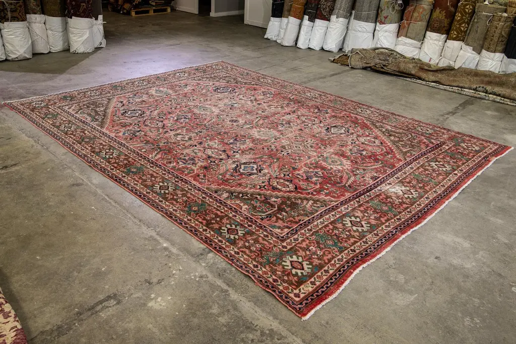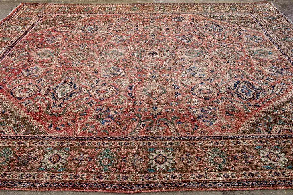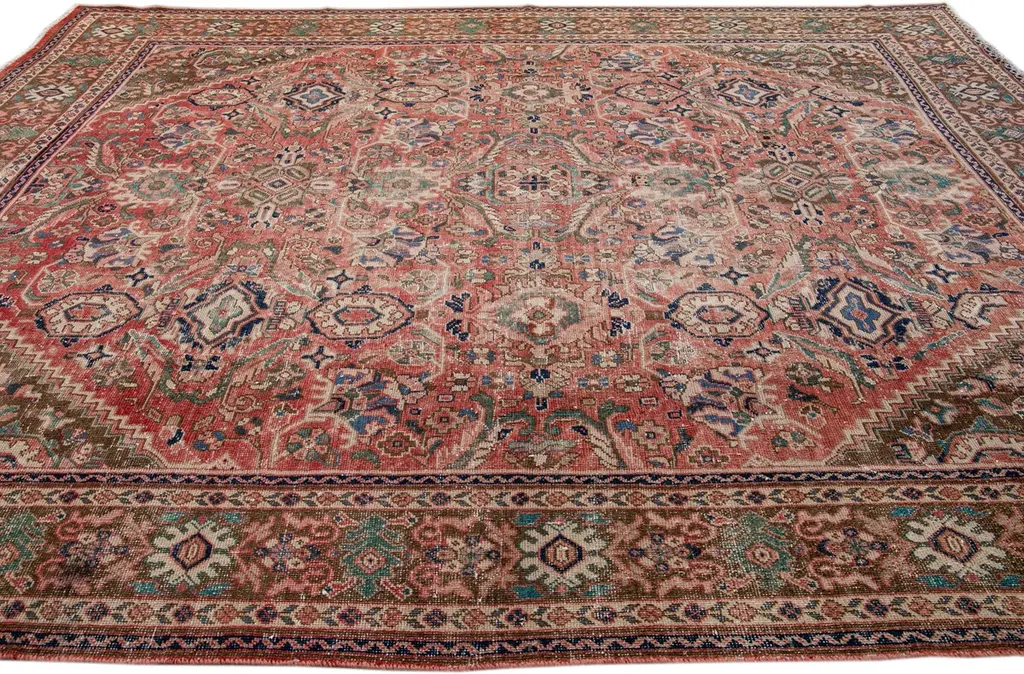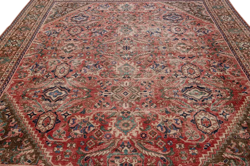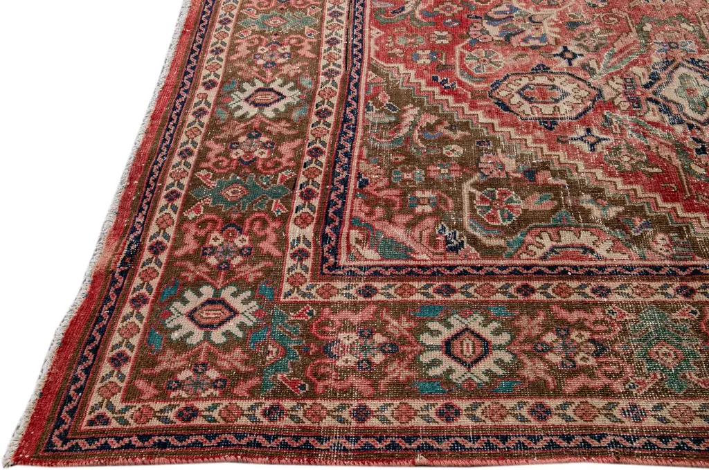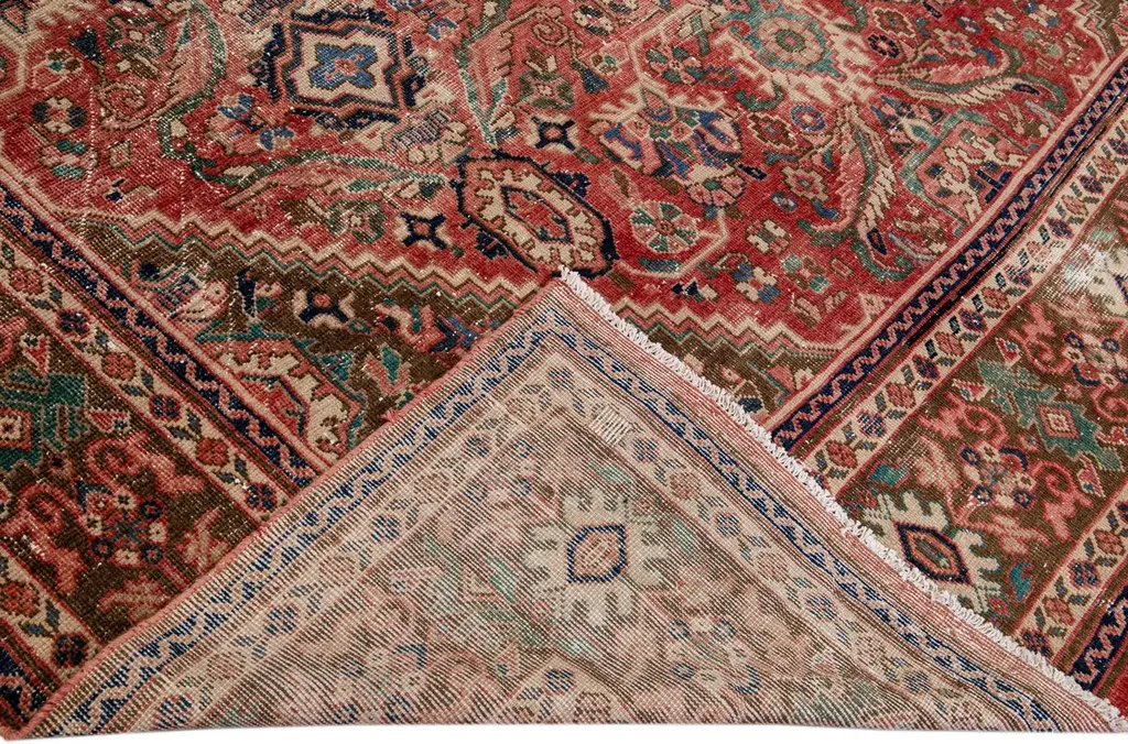 Beautiful vintage Persian distressed hand-knotted wool rug with a red field. This piece has a beige frame and multicolor accents in an all-over floral design.This rug measures: 10'4" x 13'7"
