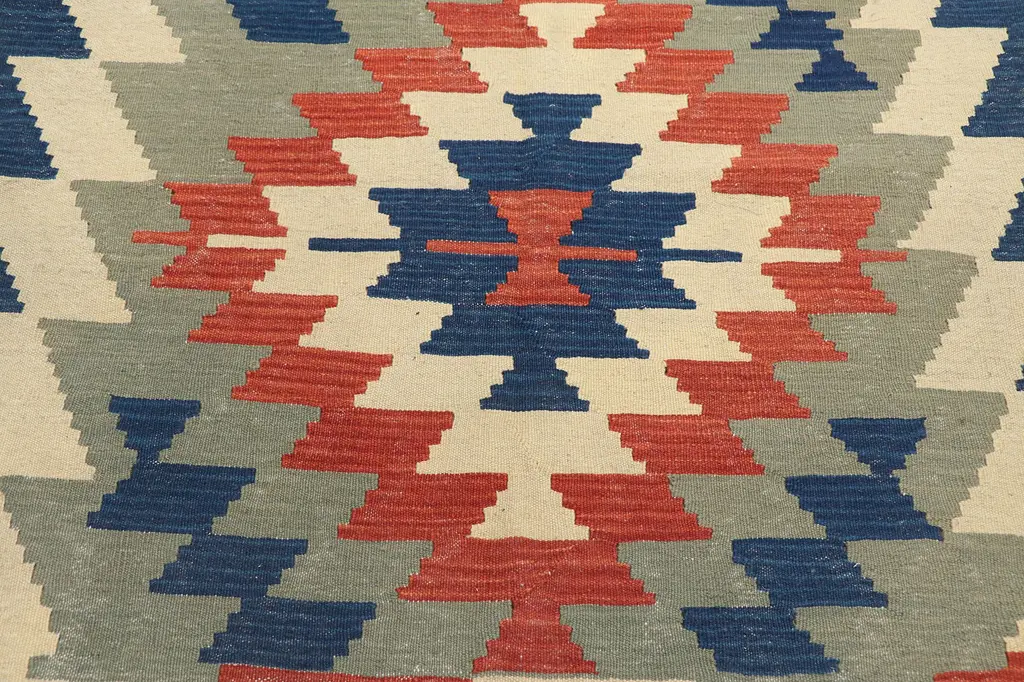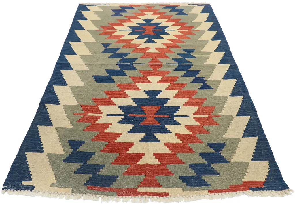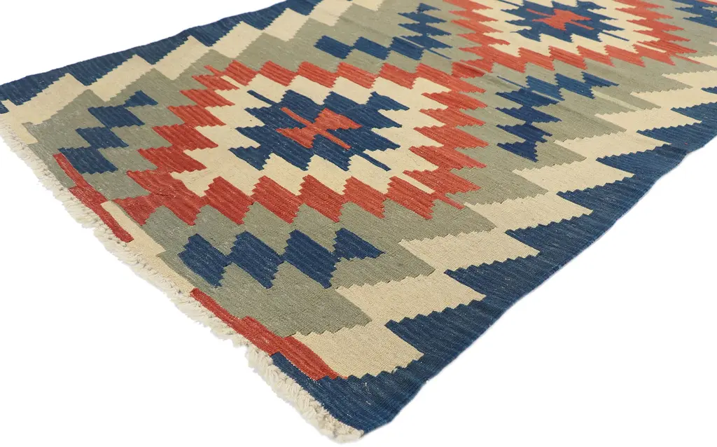 Full of tiny details and a bold expressive design combined with vibrant colors and tribal style, this hand-woven wool vintage Persian Shiraz kilim rug is a captivating vision of woven beauty. The abrashed field is composed of two concentric star motifs decorated with the fetter motif. The striking play of pattern and scale imbues this vintage Persian Shiraz rug with immense visual interest and graphic appeal.