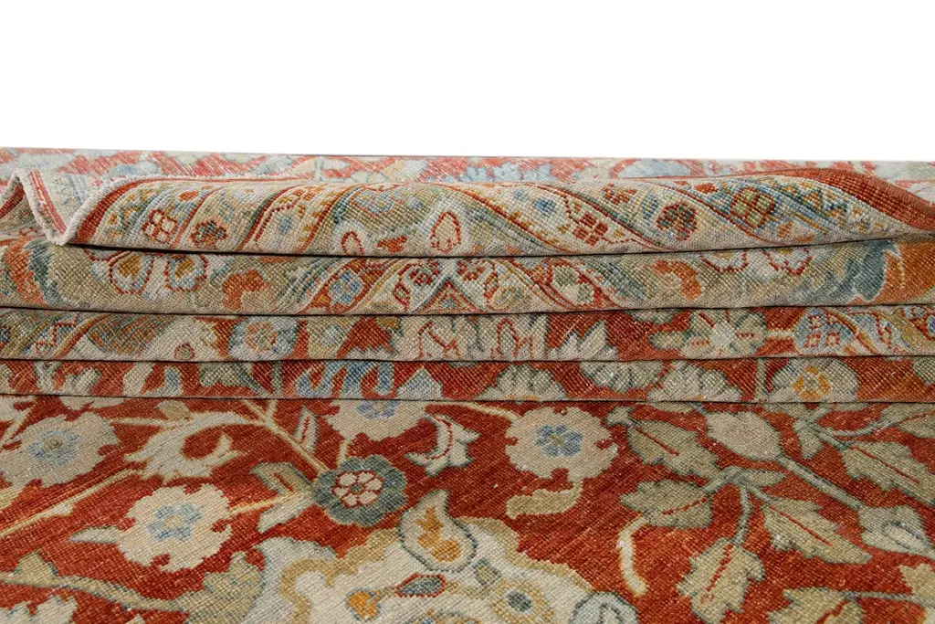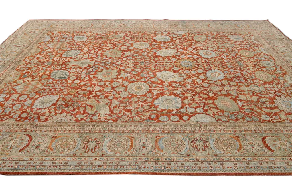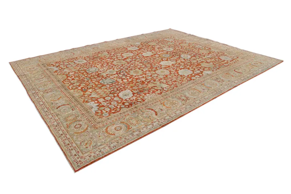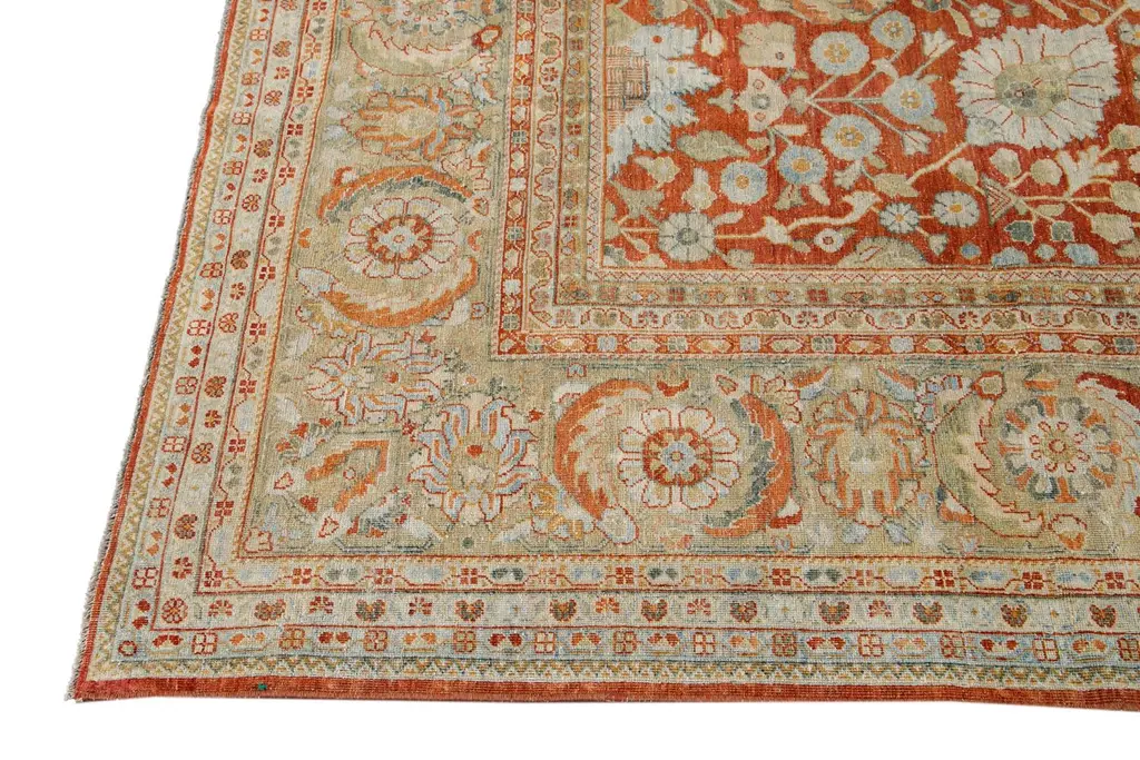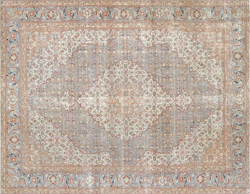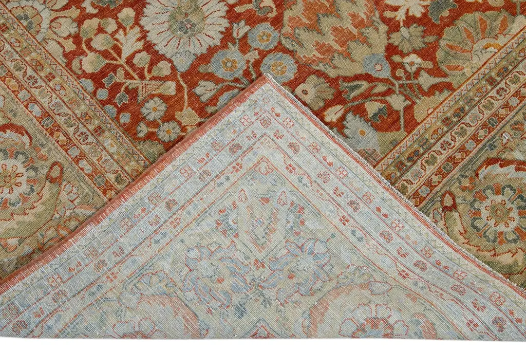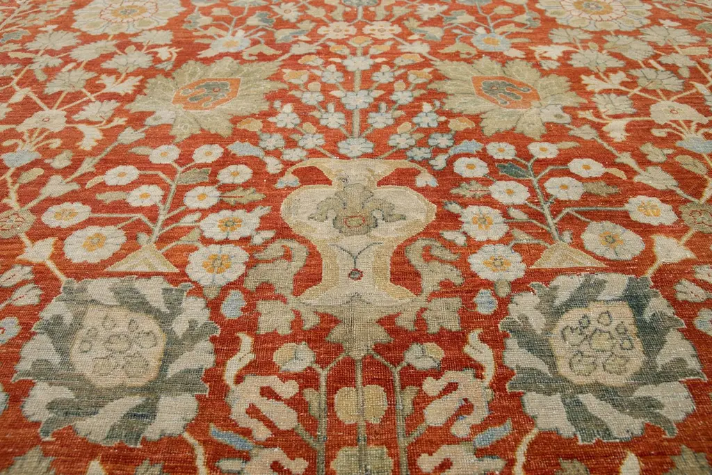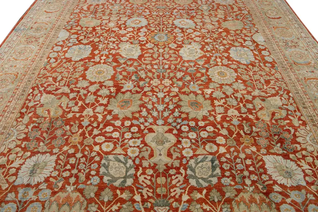 Beautiful vintage Persian Tabriz hand knotted wool rug with a red field. This Tabriz has accents of blue, beige, and ivory in a gorgeous all-over geometric floral design. This rug measures: 9'10" x 13'. Our Rugs are professionally cleaned before shipping.