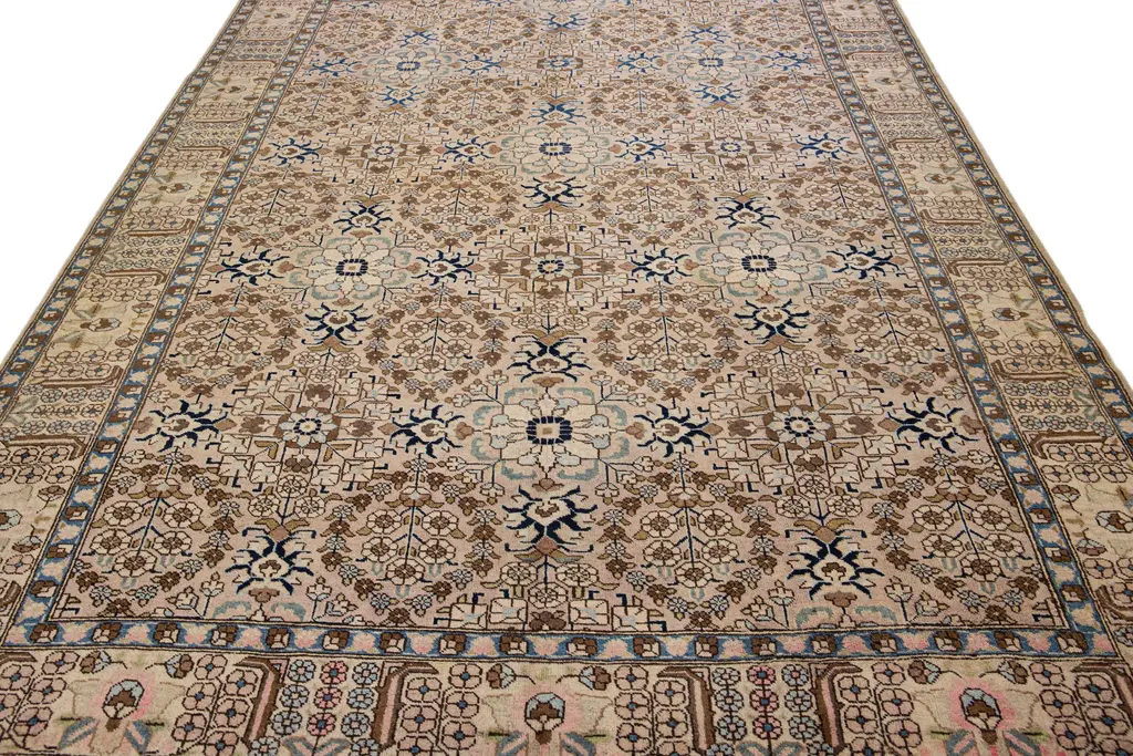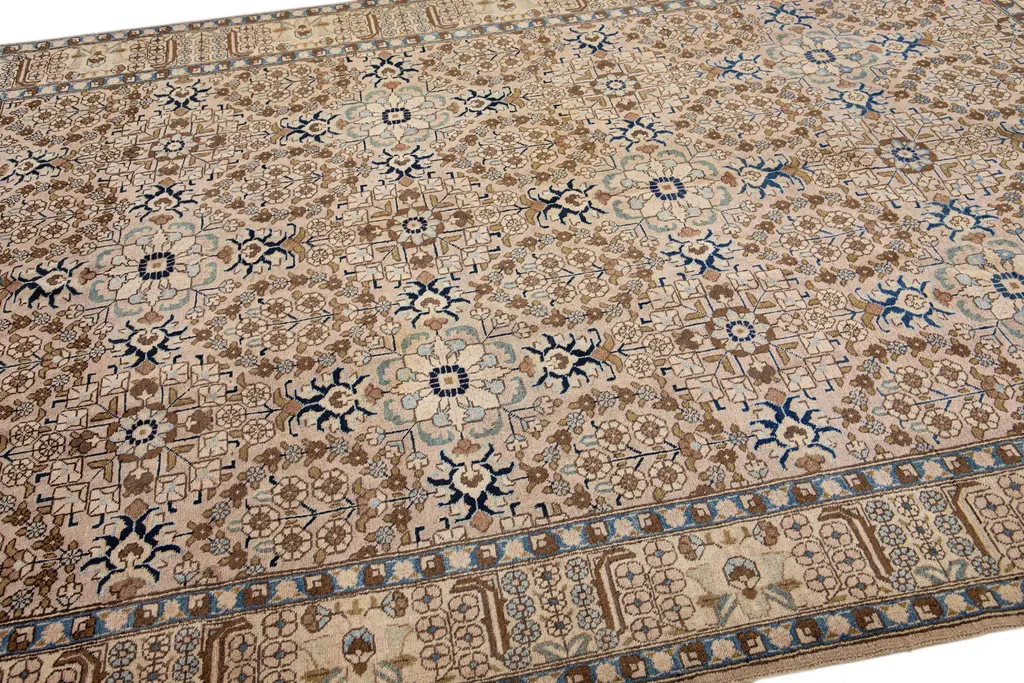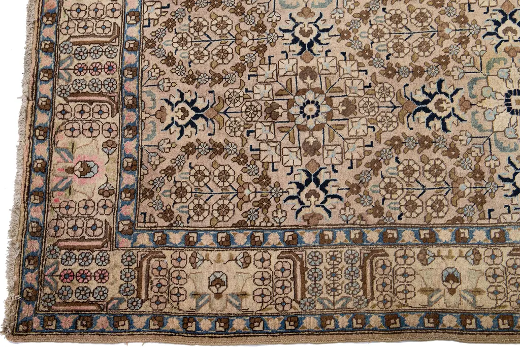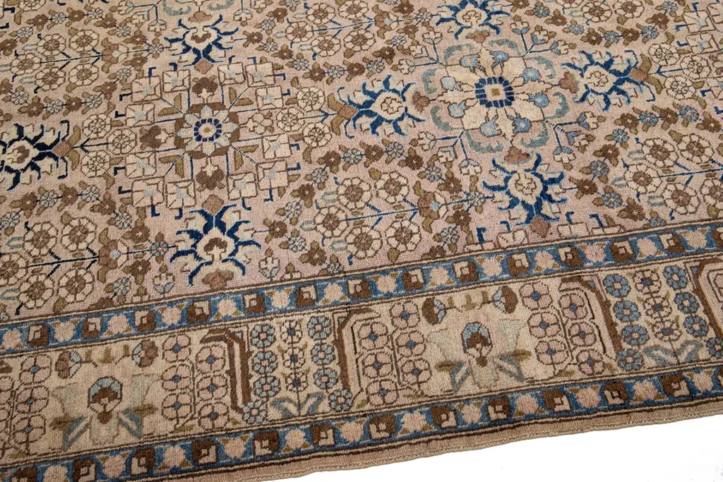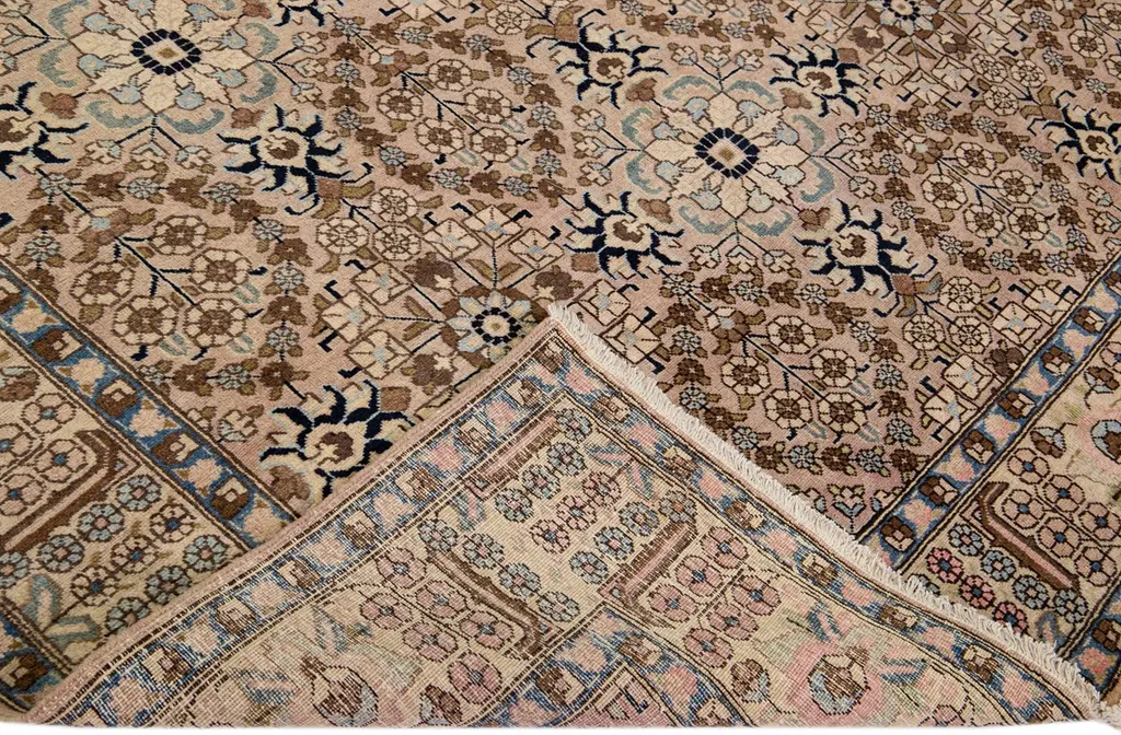 Beautiful antique Tabriz hand-knotted wool rug with a peach field. This Persian piece has blue, brown, and beige accents in a gorgeous all-over floral design. This rug measures 7' x 10'5". Our Rugs are professionally cleaned before shipping.