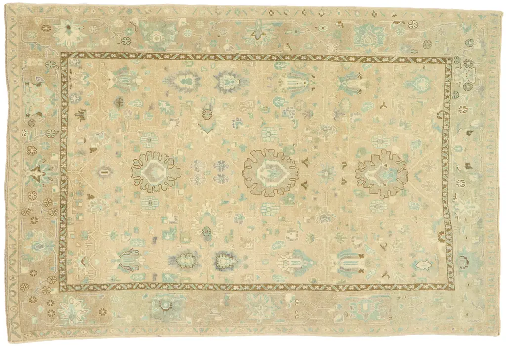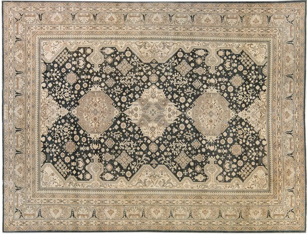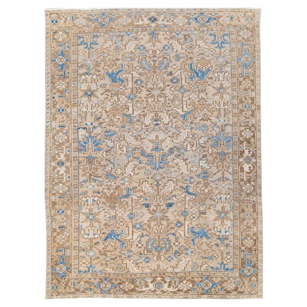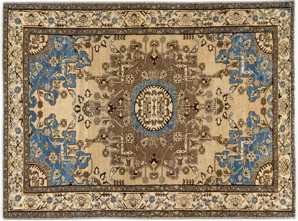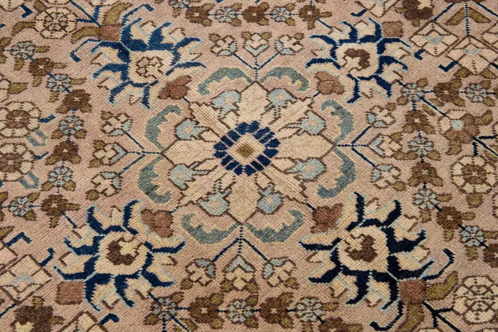 Beautiful antique Tabriz hand-knotted wool rug with a peach field. This Persian piece has blue, brown, and beige accents in a gorgeous all-over floral design. This rug measures 7' x 10'5". Our Rugs are professionally cleaned before shipping.