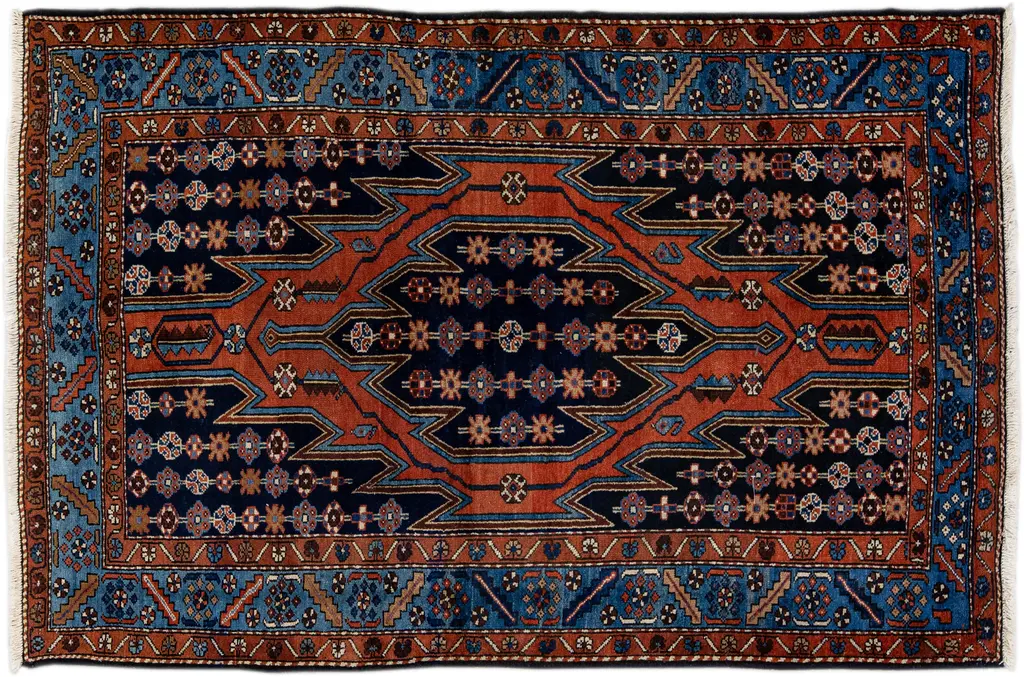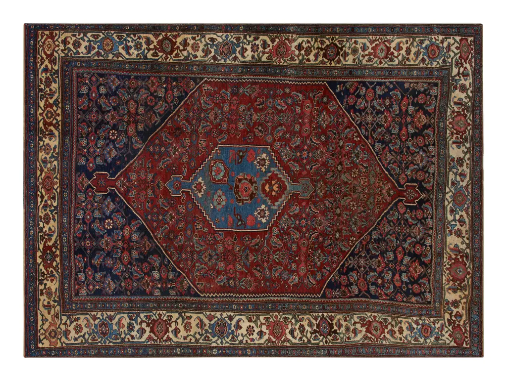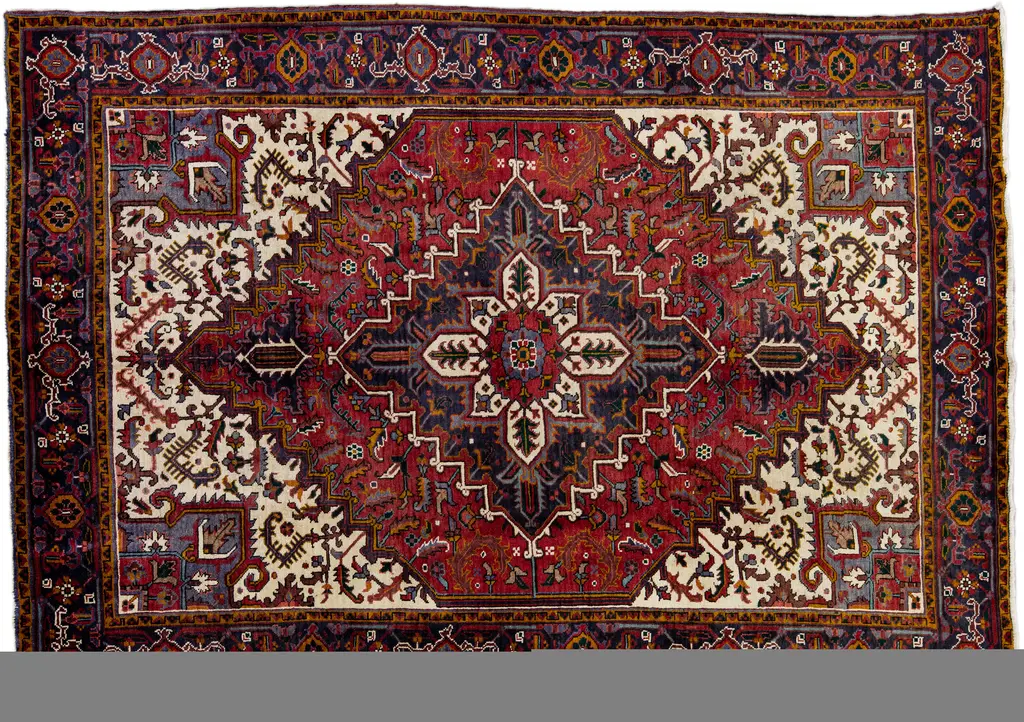 •9'9" x 6'5"•vegetable dyed wool•handwoven and knotted•traditional design of geometric patterns and central medallions•made by the nomadic qashqai peoples in iran•one of a kind•HG163256