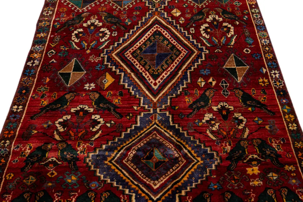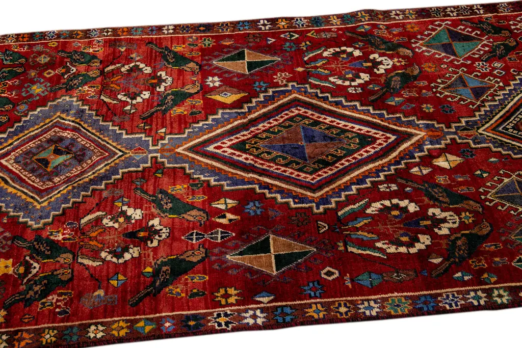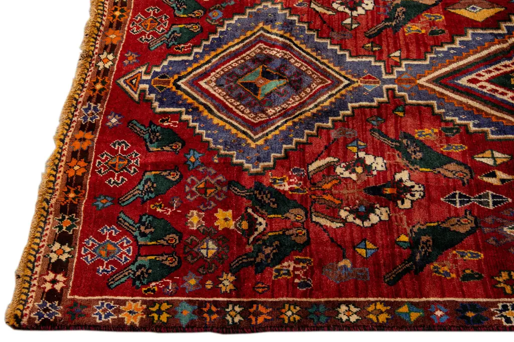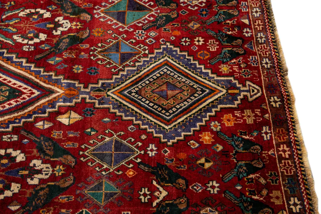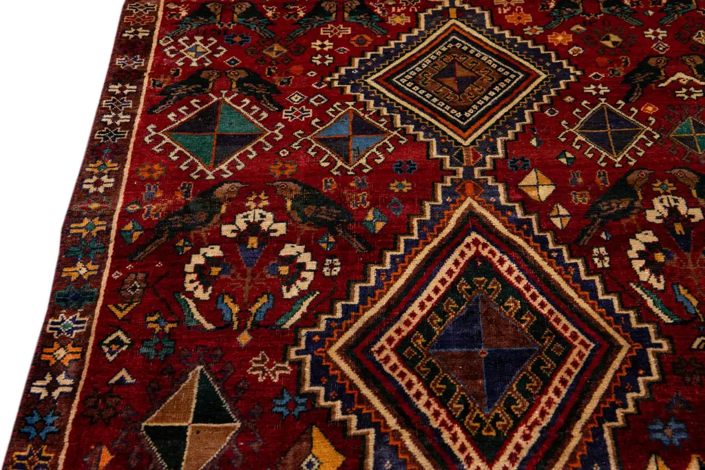 Beautiful Antique Persian Shiraz Handmade Wool rug with an all-over red field. This piece has multicolor accents in a gorgeous all-over geometric pictorial design. This rug measures: 3'10" x 7'3".