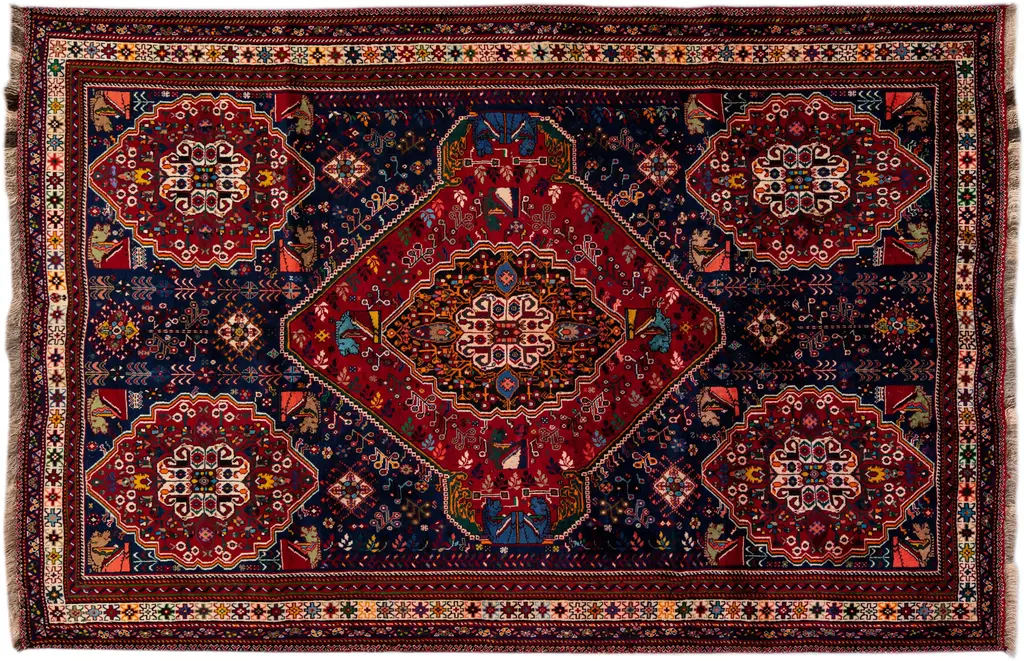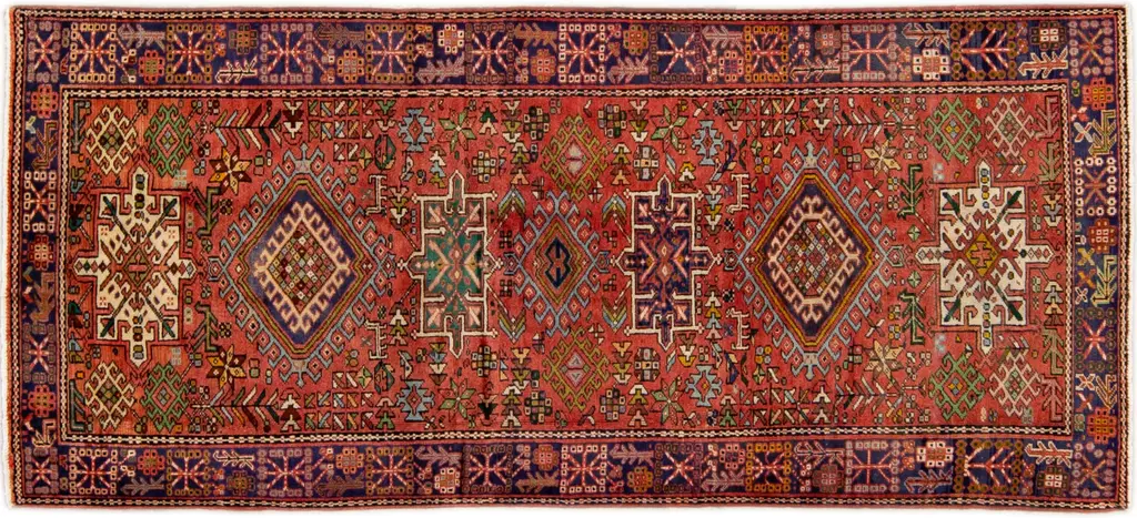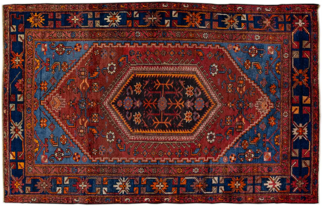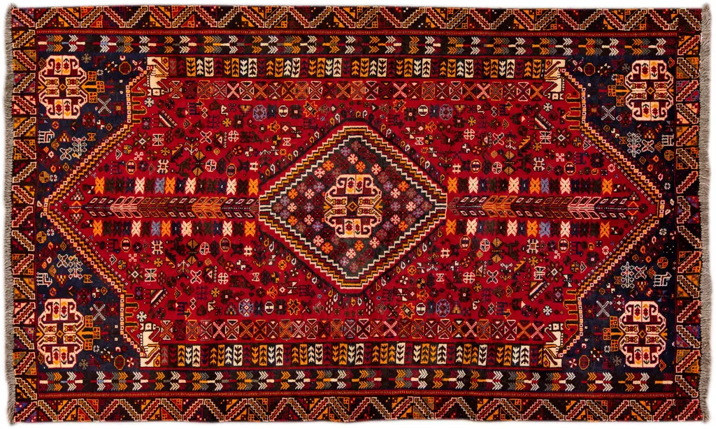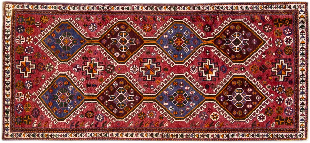 Beautiful Antique Persian Shiraz Handmade Wool rug with an all-over red field. This piece has multicolor accents in a gorgeous all-over geometric pictorial design. This rug measures: 3'10" x 7'3".