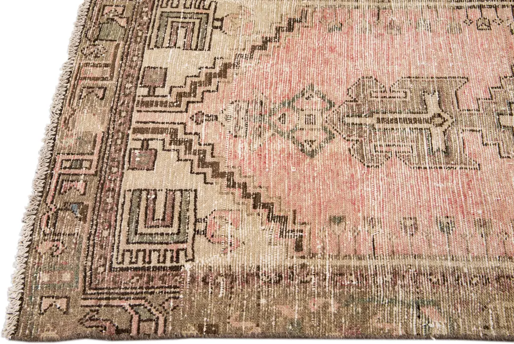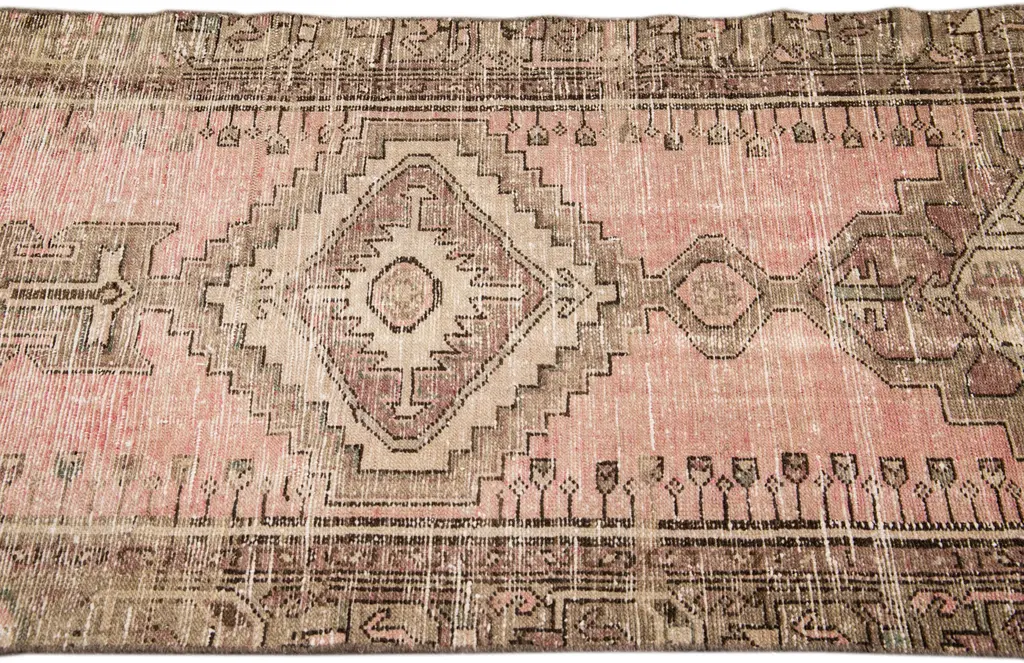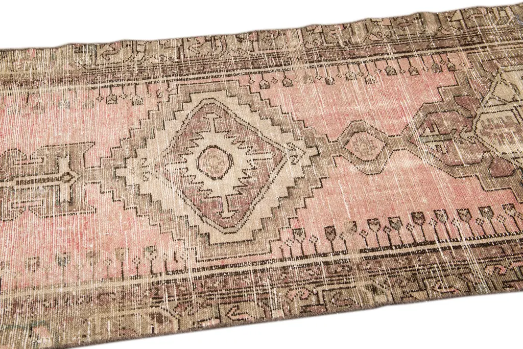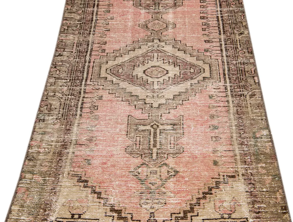 Beautiful Vintage Tribal hand-knotted wool rug with a pink field. This rug has brown and tan accents all-over a geometric tribal distressed design. This rug measures: 2'9" x 7'5". Our Rugs are professionally cleaned before shipping.