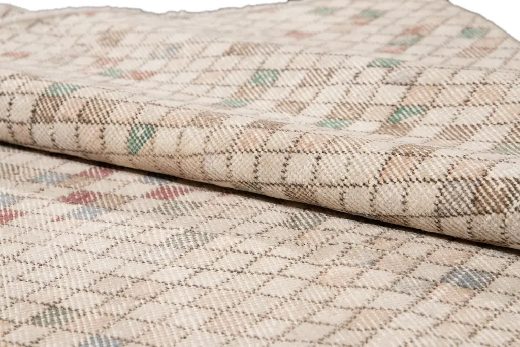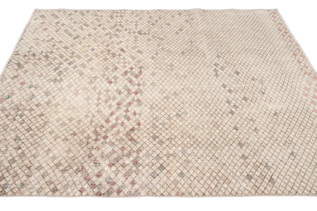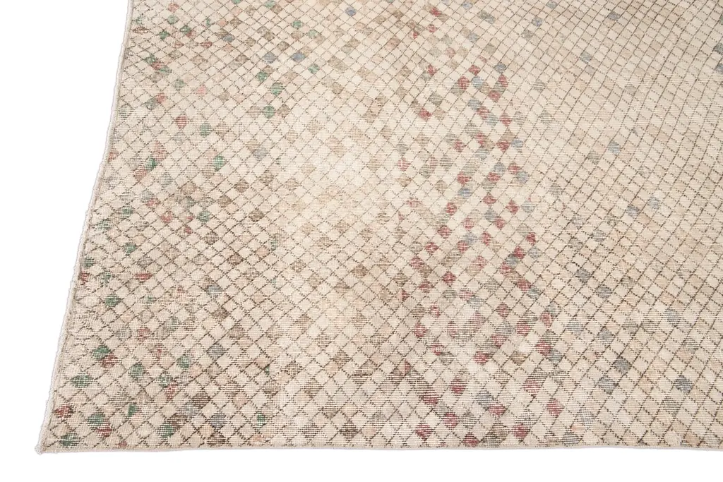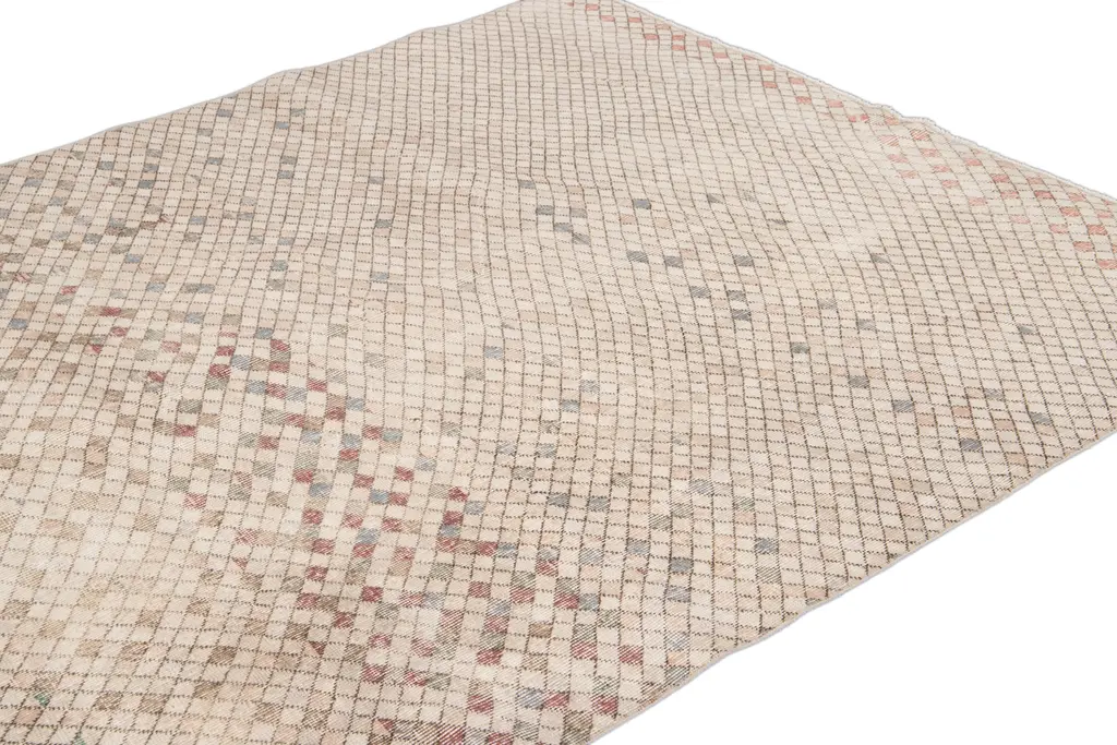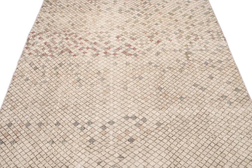 Beautiful vintage Turkish hand-knotted wool rug with a beige field. This Turkish rug has red, blue, green, and orange accents in a gorgeous all-over geometric Pattern design. This rug measures: 4'7" x 7'6". Our Rugs are professional cleaning before shipping.
