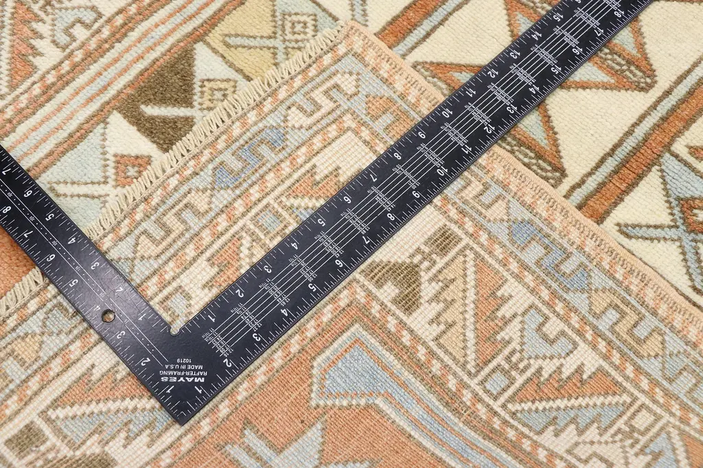 This hand-knotted wool vintage Turkish Oushak rug features an all-over geometric pattern comprised of ambiguous Anatolian motifs. It is finished with a leaf and calyx style (wine glass) border flanked with an outer Cengel hook guard border and subsidiary barber pole stripes. The striking play of pattern and scale imbues this vintage Oushak rug with immense visual interest and graphic appeal.
