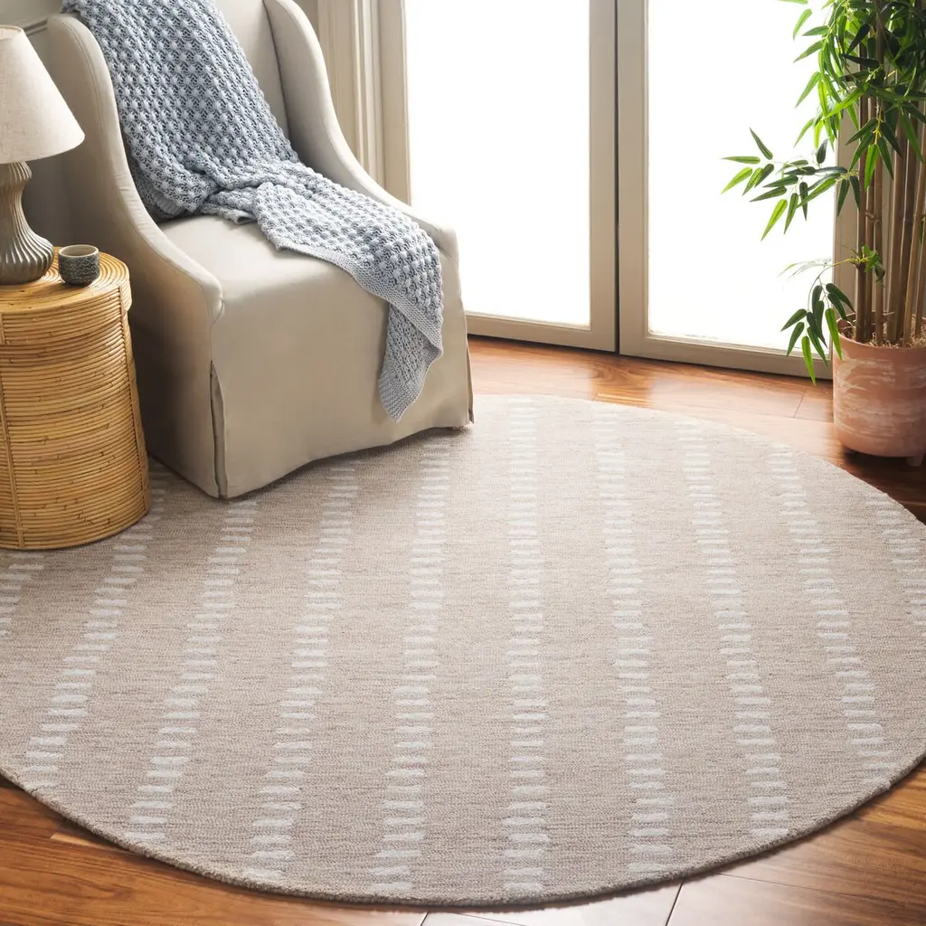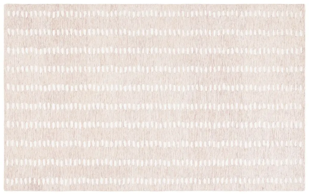 Elevate your decor with this meticulously crafted 10 x 14 large rectangle area rug, colored in soothing beige and ivory tones that will add a touch of elegance and warmth to any room. With a comfortable 3/8 inch pile height, this hand tufted rug merges luxury with durability, creating a plush, inviting surface that is delightful underfoot. Constructed from a premium blend of 70% wool, 20% chenille, and 10% cotton, this rug offers an exquisite feel with the resilience needed for high-traffic areas. The wool provides a natural softness and durability, while the chenille adds a subtle sheen and texture variation, with cotton ensuring the rug remains breathable. Each rug is responsibly handcrafted by skilled artisans in India, embodying a modern style that seamlessly complements contemporary interiors. The refined pattern displayed in the image, showcasing a series of dotted lines in a regimented formation, imparts a sense of rhythm and motion to the space it inhabits. Whether placed in a living room, dining area, or bedroom, this rug's neutral palette ensures it integrates impeccably with any color scheme or design aesthetic, providing an understated yet sophisticated foundation for your furnishings.