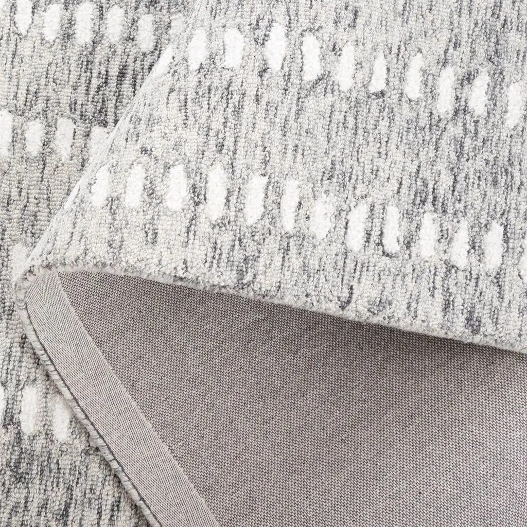 Elevate your decor with this meticulously crafted 10 x 14 large rectangle area rug, colored in soothing beige and ivory tones that will add a touch of elegance and warmth to any room. With a comfortable 3/8 inch pile height, this hand tufted rug merges luxury with durability, creating a plush, inviting surface that is delightful underfoot. Constructed from a premium blend of 70% wool, 20% chenille, and 10% cotton, this rug offers an exquisite feel with the resilience needed for high-traffic areas. The wool provides a natural softness and durability, while the chenille adds a subtle sheen and texture variation, with cotton ensuring the rug remains breathable. Each rug is responsibly handcrafted by skilled artisans in India, embodying a modern style that seamlessly complements contemporary interiors. The refined pattern displayed in the image, showcasing a series of dotted lines in a regimented formation, imparts a sense of rhythm and motion to the space it inhabits. Whether placed in a living room, dining area, or bedroom, this rug's neutral palette ensures it integrates impeccably with any color scheme or design aesthetic, providing an understated yet sophisticated foundation for your furnishings.