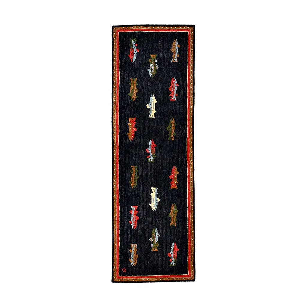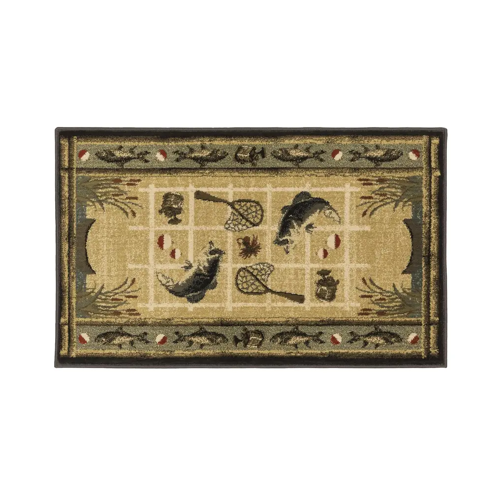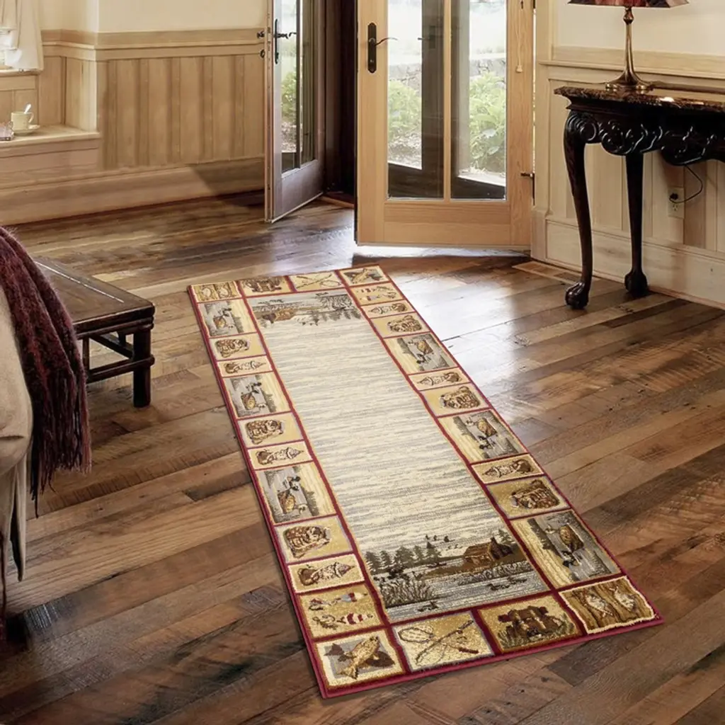 With a rustic lakeside motif and stylized border, this handsome Vista Lakeside Retreat Rug is crafted of flame-resistant, 100% Olefin fibers, making it perfect for in front of your hearth. It's large 30" x 50" size protects a wide area. It's also a cozy addition to any den, cabin, family room and more! Ultra-durable, heavy-twist yarn is tough and colorfast to resist staining, making it ideal for high-traffic areas.Made in the USA
