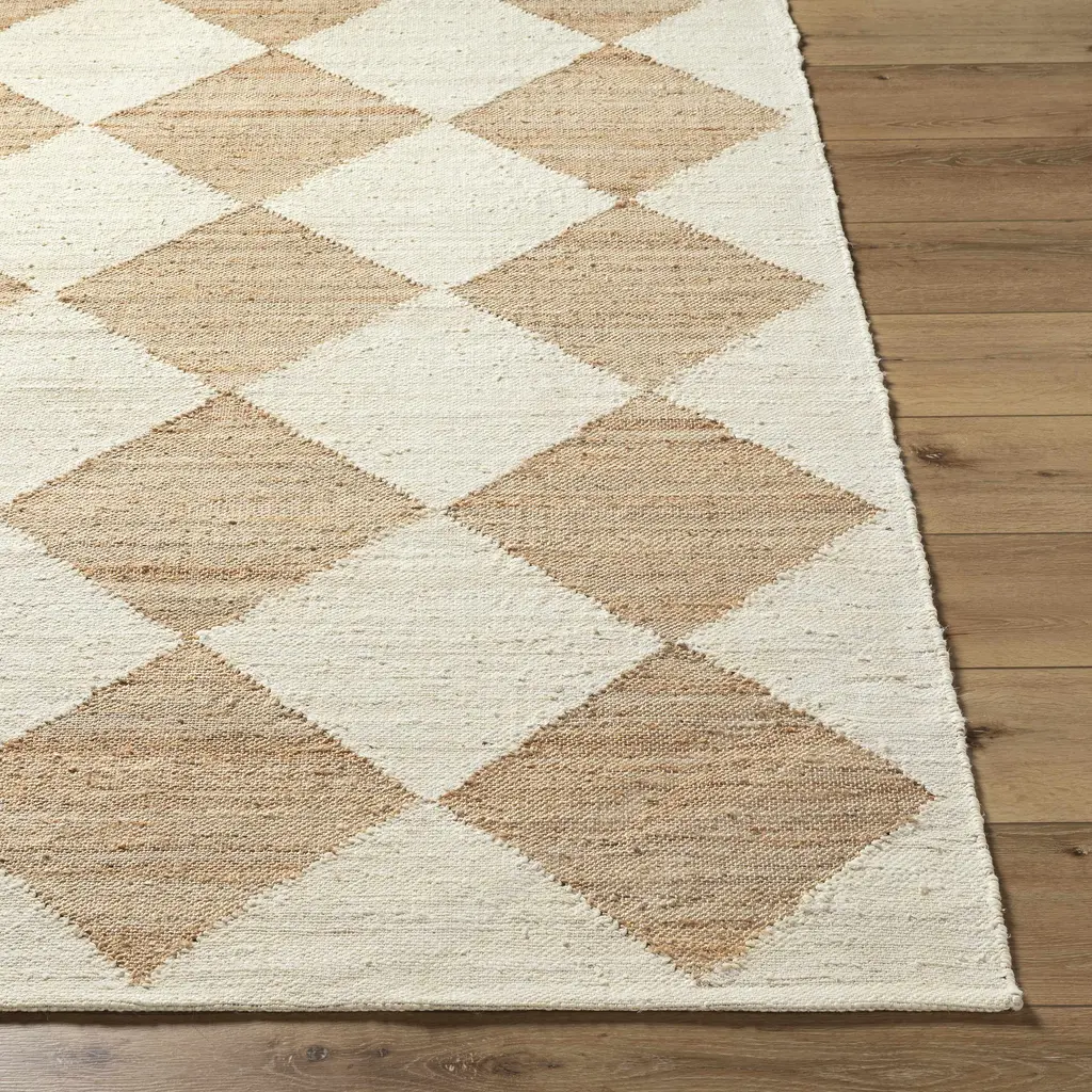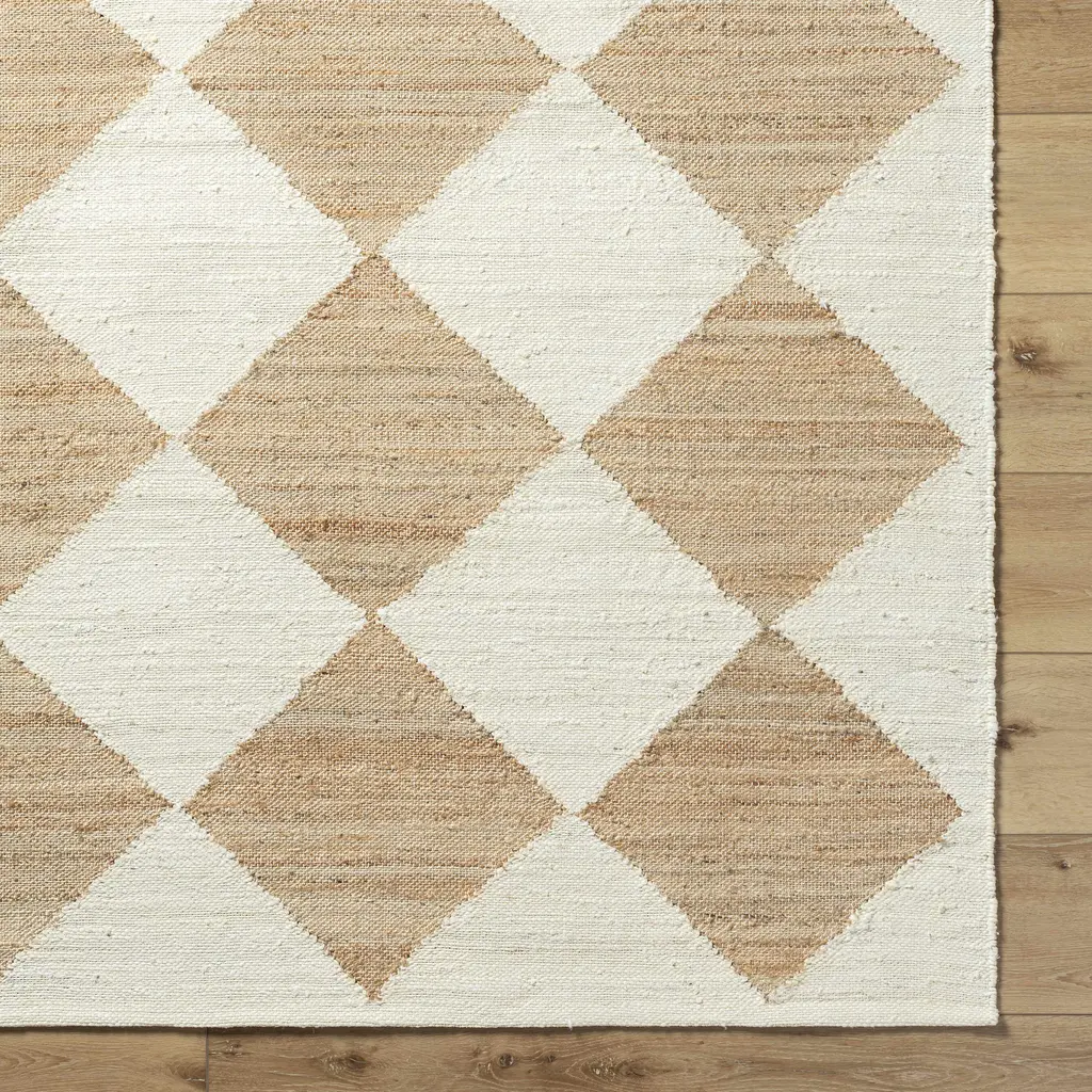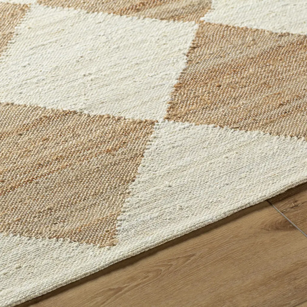 Collection: Andrin Colors: Beige, Camel Construction: Hand Woven Material: 100% Jute Pile: No Pile Made In: India Thickness: 0.4" Price Range: $$$$$ (Affordable)