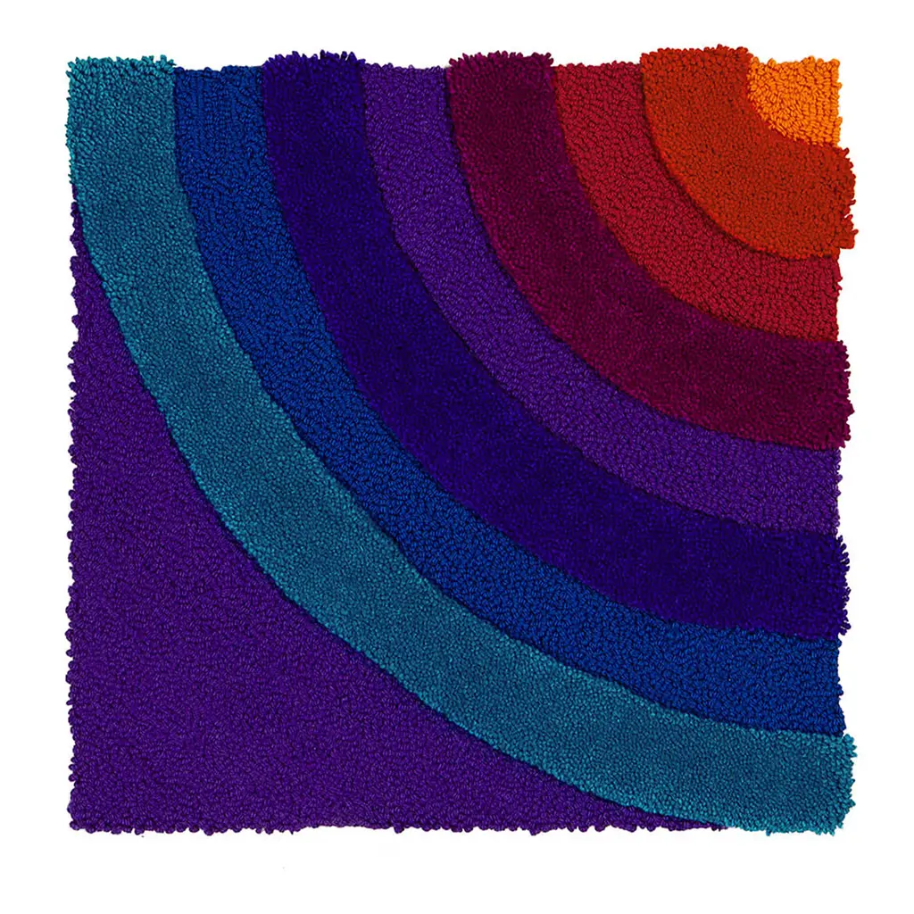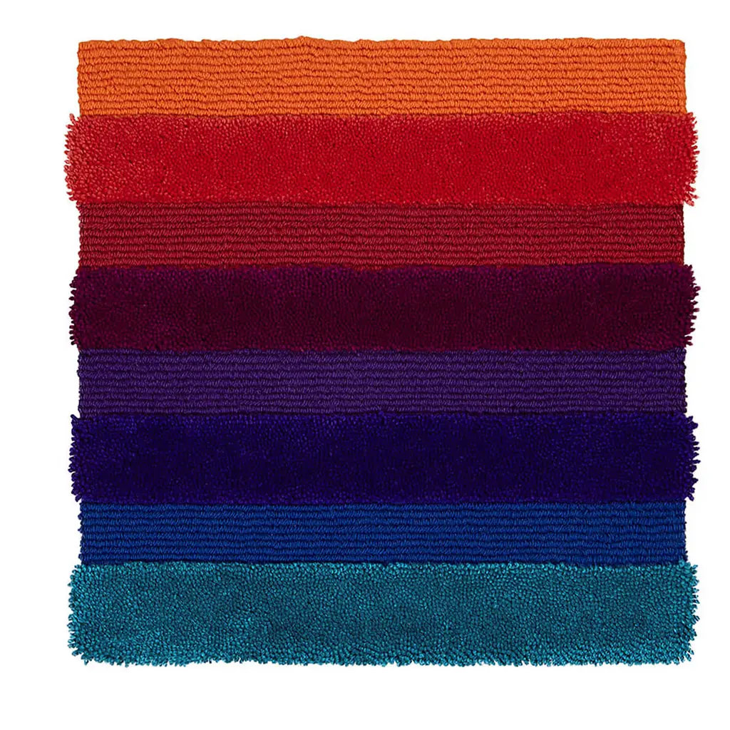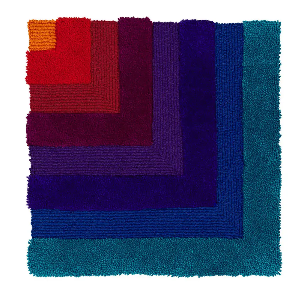 Color vibrancy and geometric rigor effortlessly coexist in this exquisite artisan rug, an exclusive member of a modular collection inspired by a 1974 project. The eight color tones from the Panton series are showcased by the concentrical square frames punctuating its fleece. Sections are further enhanced by contrasting heights that also offer an intriguing tactile feel. Please contact the Concierge for customizations.