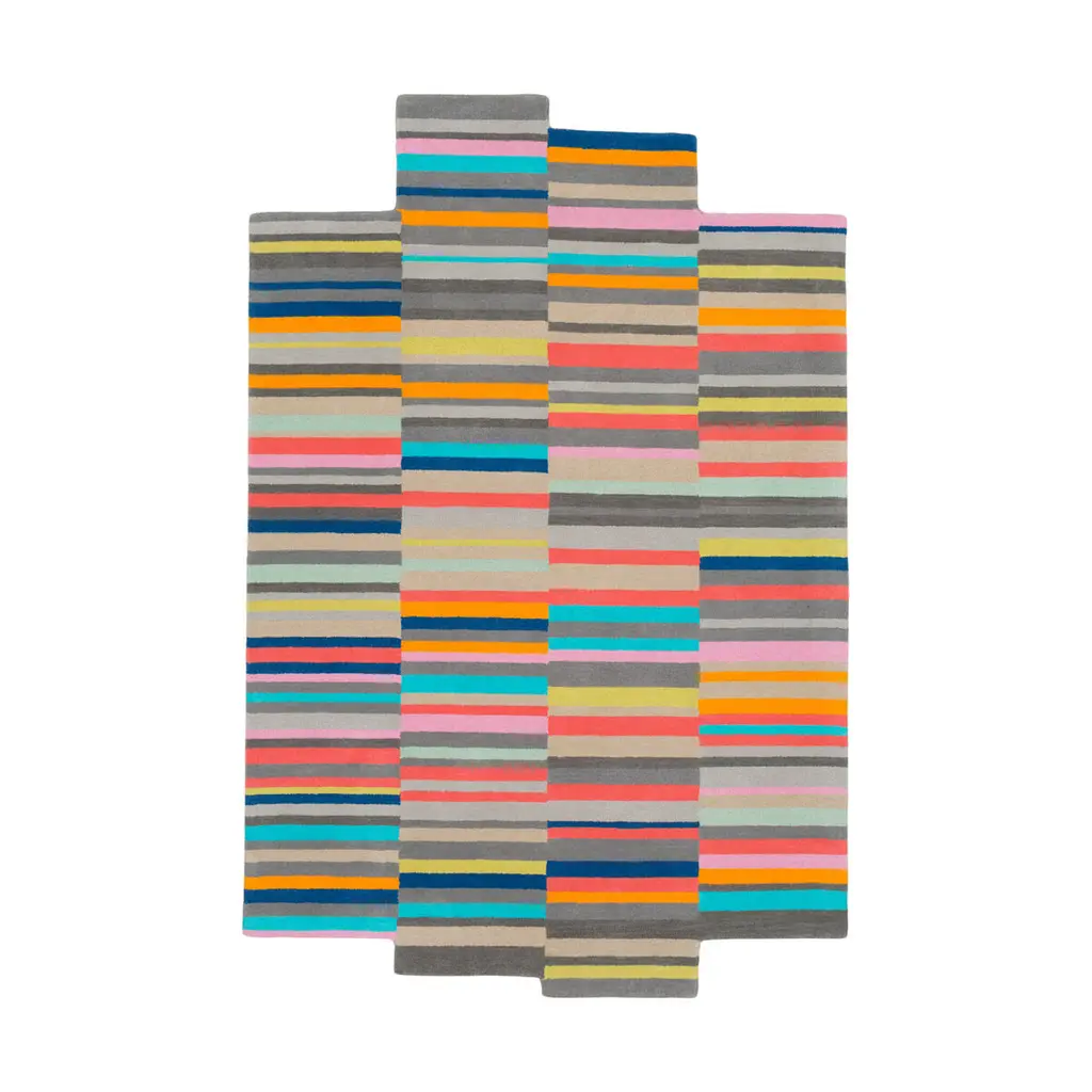 Masterfully hand-tufted in India from prized wool yarns, this square rug belongs to a series conceived to suggest eccentric modular compositions for enlivening walls or floors. Inspired by a 1974 project, it echoes a daring vintage flair confirmed by the selection of all 8 colors from the Panton series for its hypnotizing pattern of concentrical square frames. Please explore customization options with the Concierge.