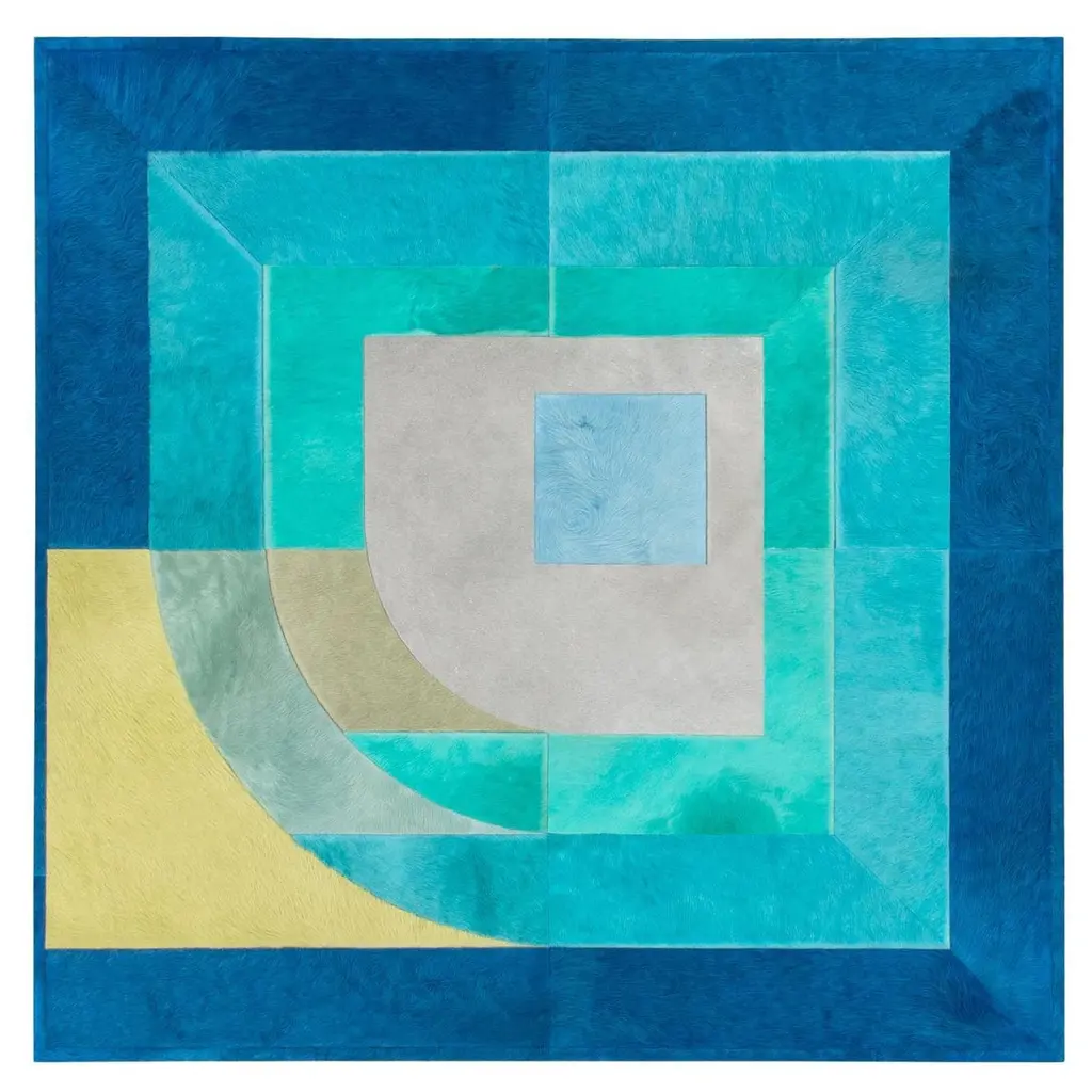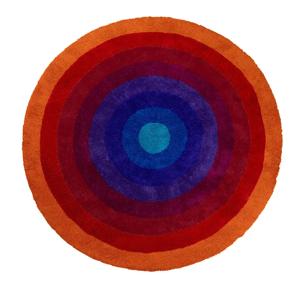 Hypnotizing in its concentrical design as it is daring in its juxtaposition of cool and warm shades, this rug is an exercise in geometry and color. A subtle shag with tall fleece further enriches its already impactful aesthetic, which results so precise thanks to the artisans who, in India, minutely knot it by hand using prized New Zealand wool. An inverted chromatic variant is also available in the Artemest catalog.
