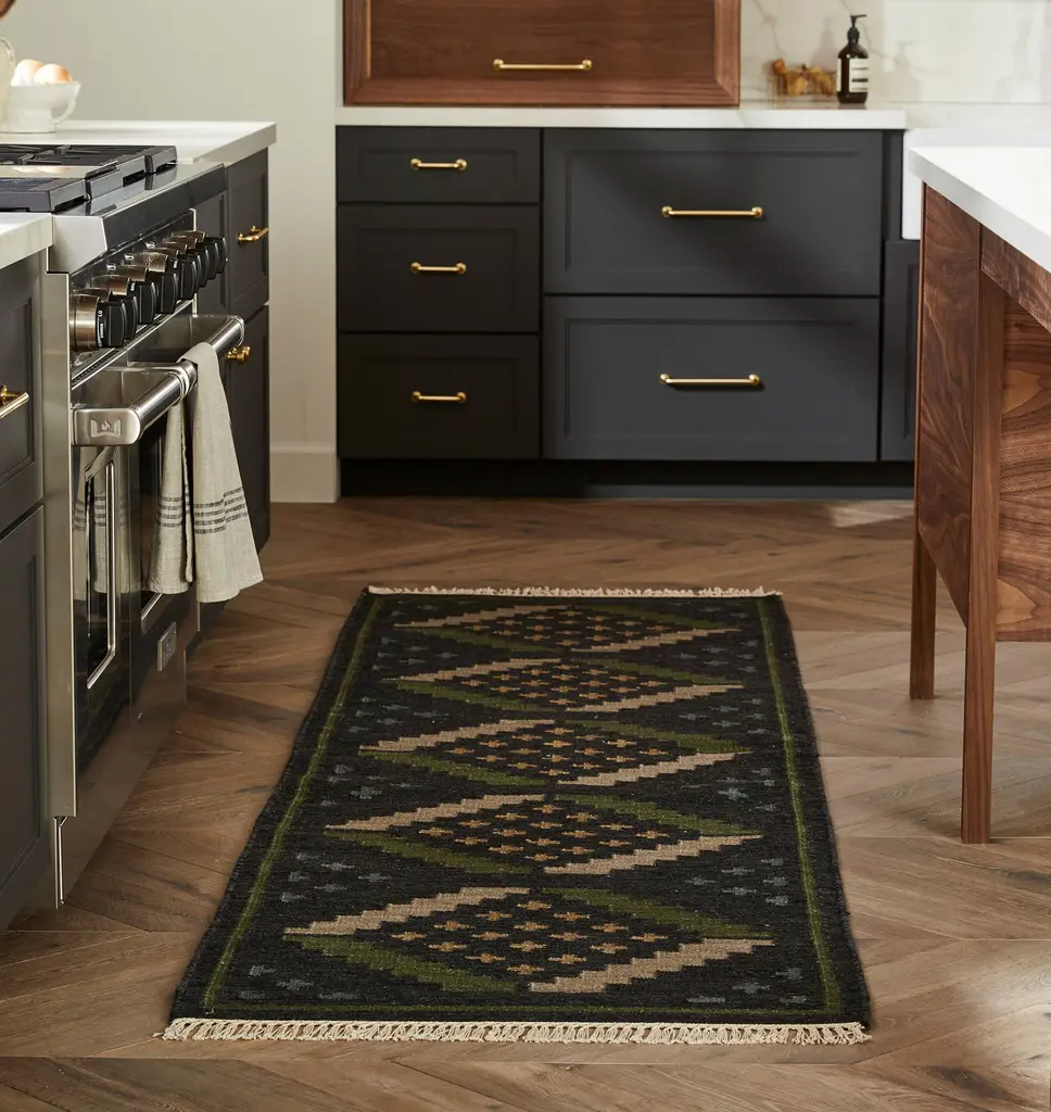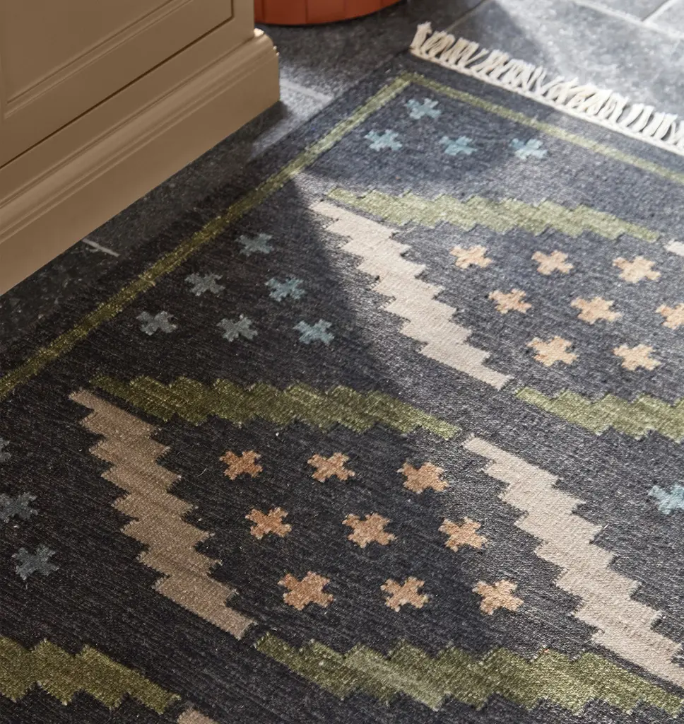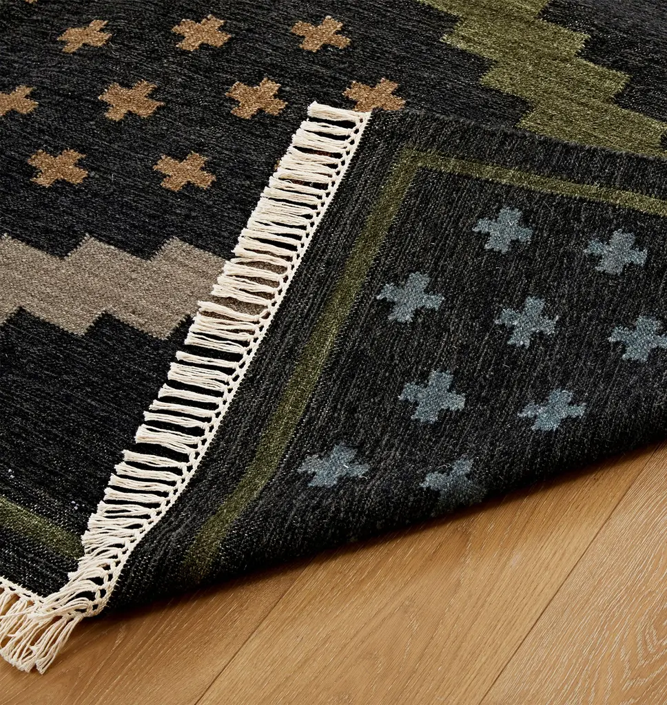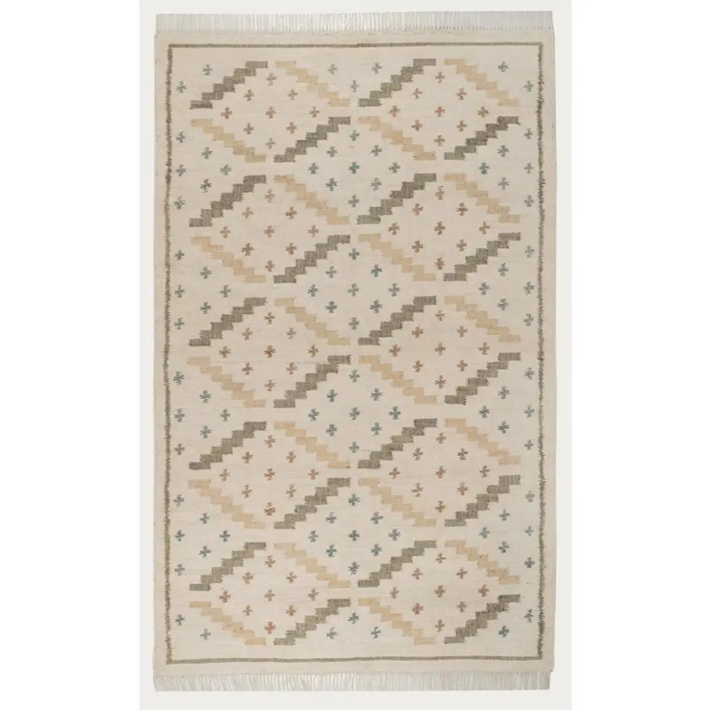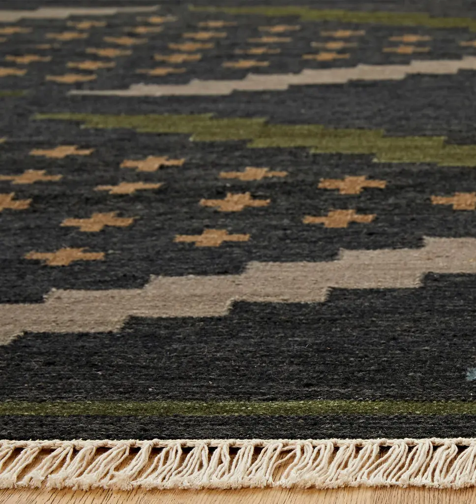 Featuring a traditional double diamond motif and a bold color palette, our Waite Flatweave Rug will make a statement in any area of your home. The resilient nature of its wool and cotton blend will make this a staple in your home for years to come. Details You'll Appreciate Reversible Crafted 100% by hand using a flatweave technique Product Specifications Wool/Cotton Blend 75% wool, 25% cotton Thickness: 3/8" Fringe Length: Appox. 3-1/2" (fringe length is not included in overall dimensions) Scale of motifs, pattern, and borders will adapt according to rug size Corner swatch represents 8' x 10' motif Use of a rug pad is recommended India Care Instructions Shedding of loose fibers is normal with new wool rugs and a natural result of being handcrafted. Shedding will diminish with regular vacuuming, usually after 3-6 months. Vacuum regularly on a low-power setting to prevent debris from settling into roots of the fibers. Use a vacuum cleaner without a beater brush as it may cause damage to the pile. Avoid direct and continuous exposure to sunlight. Do not pull loose ends. Clip them with scissors. Rotate rug occasionally to equalize wear. Remove spills immediately. If liquid, blot with clean, undyed cloth by pressing firmly around spill to absorb as much as possible. For hard-to-remove stains, professional rug cleaning is recommended.